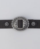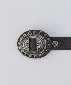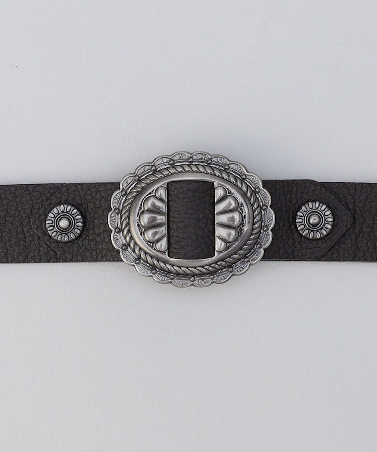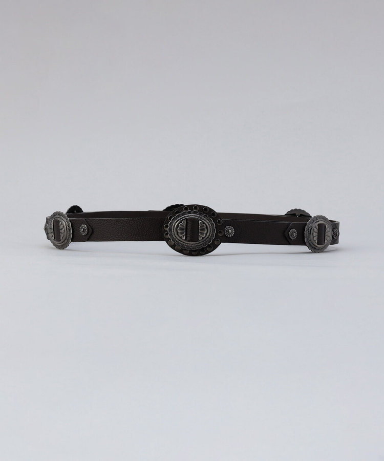 ブラックニッケルサティーナ仕上げのメタルパーツと、ダークブラウンの牛革を組み合わせたヴィンテージ風コンチョベルトです。