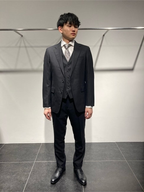シャツはホワイトベースに細かなドット柄を取り入れ、ネクタイとの統一感を演出しています。足元は黒のストレートチップシューズでフォーマル度を高め、全体をスマートに引き締めた仕上がりになります。