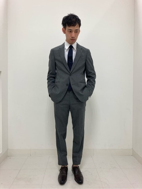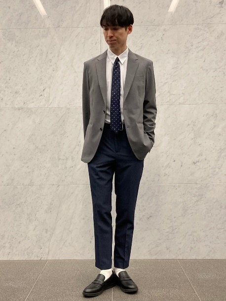 ライトグレーのジャケットに、ネイビースラックスを合わせた清潔感のあるスタイルです。ホワイトシャツとドット柄ネイビータイの組み合わせが、落ち着きを感じさせるので、式典の場でも好印象を与えます。