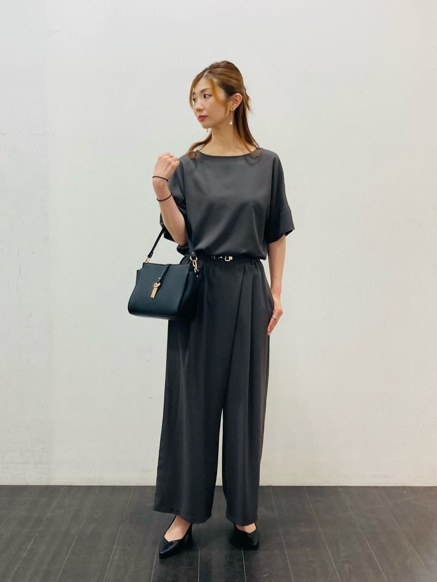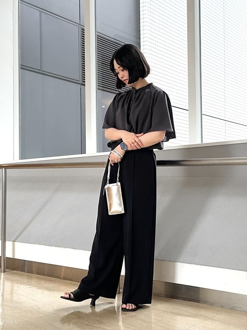 トップスは袖ボリュームとAラインが大人可愛いデザイン。下に向かって少し細くなっているテーパードパンツと合わせることでトップスをインしなくてもバランスのいいスタイリングに。