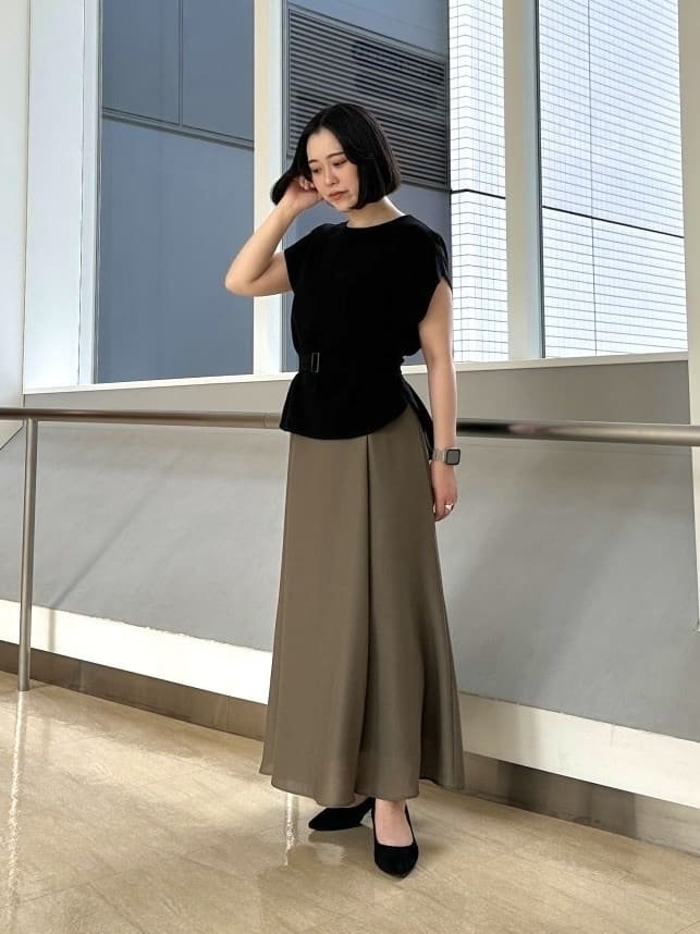 ベルト付きのトップスにマーメイドラインが女性らしいスカートを合わせて上品に。