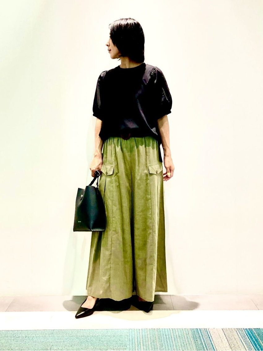 ゆるっとしたシルエットなので小物を黒で引き締めているのがポイント。