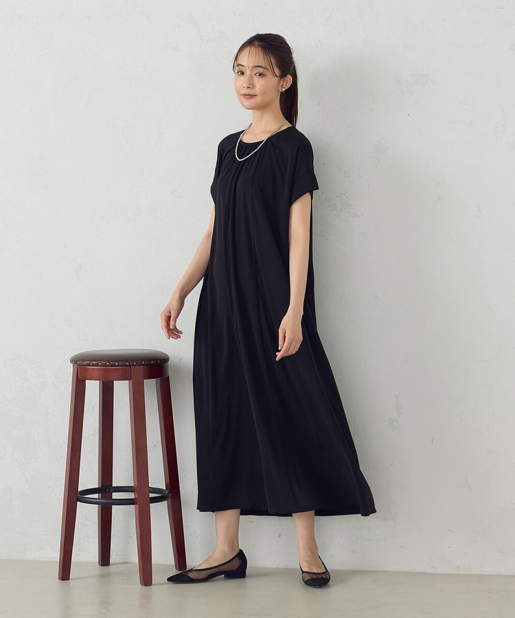 ネックラインに入ったギャザーがやさしく女性らしさを演出しながら、すっきりとした縦ラインでスタイルアップもかなえます。