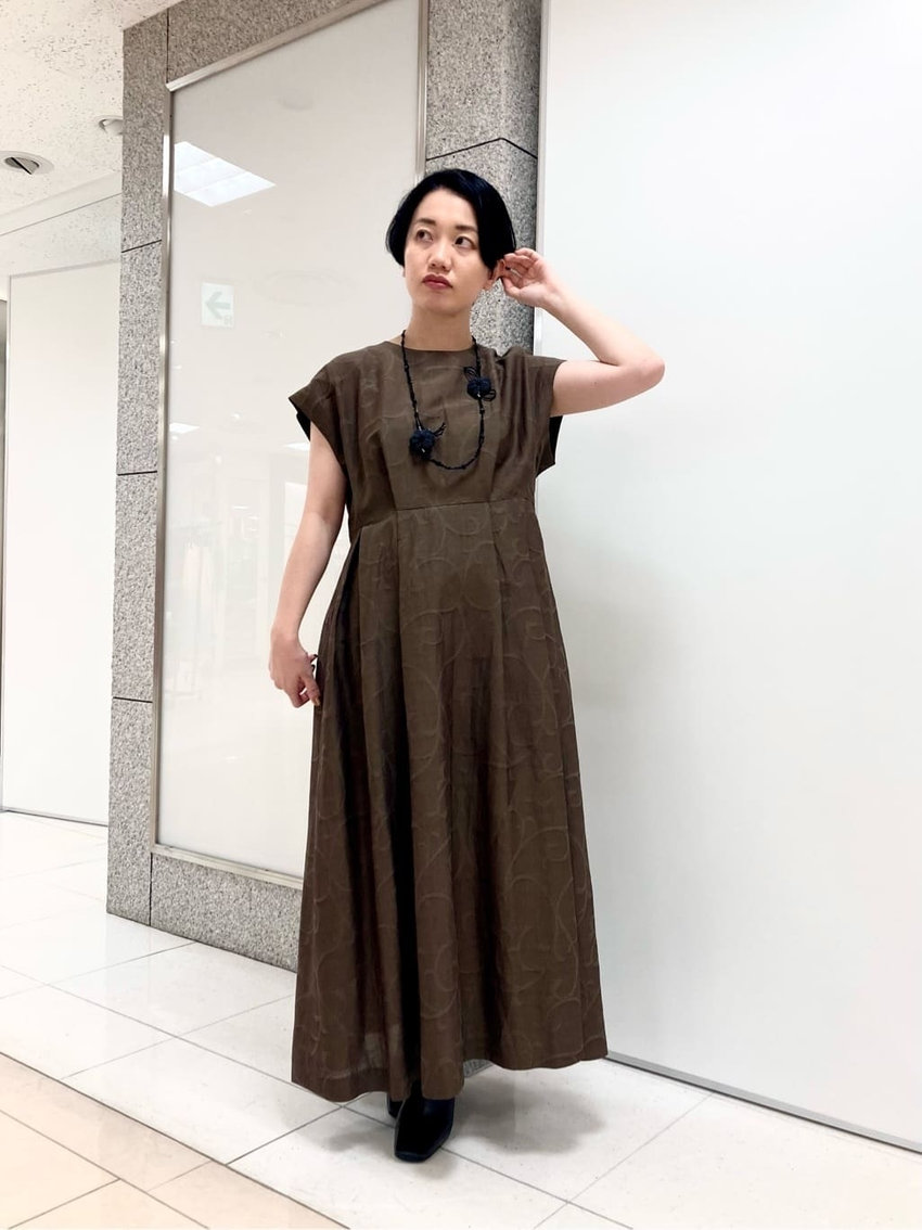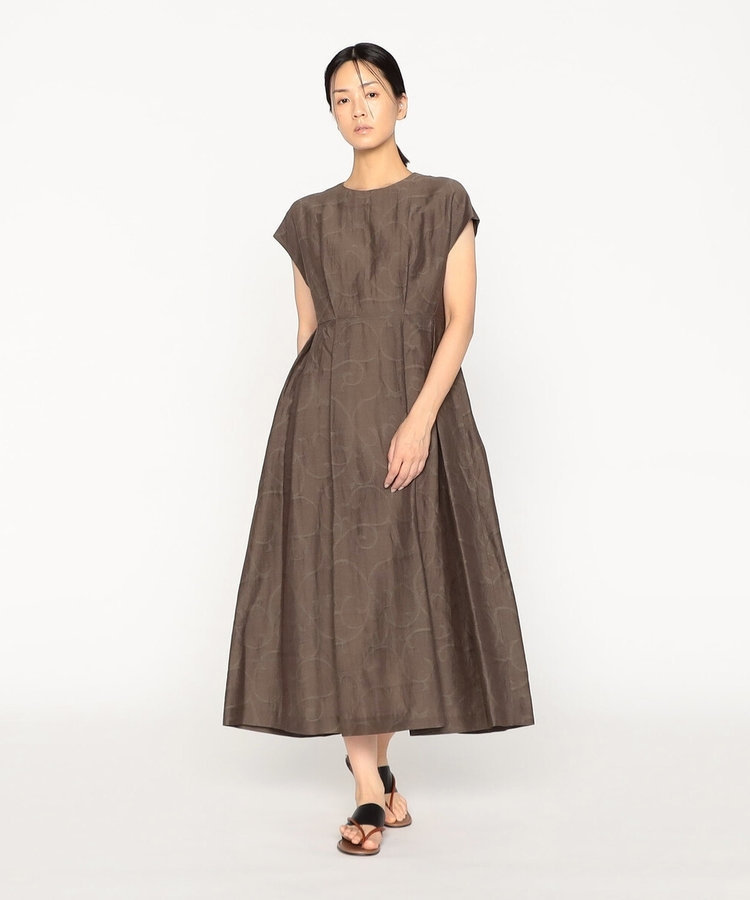 唐草柄ジャカードの上品な風合いが印象的なフレアワンピースは、落ち着いたブラウンカラーで大人の余裕を演出します。