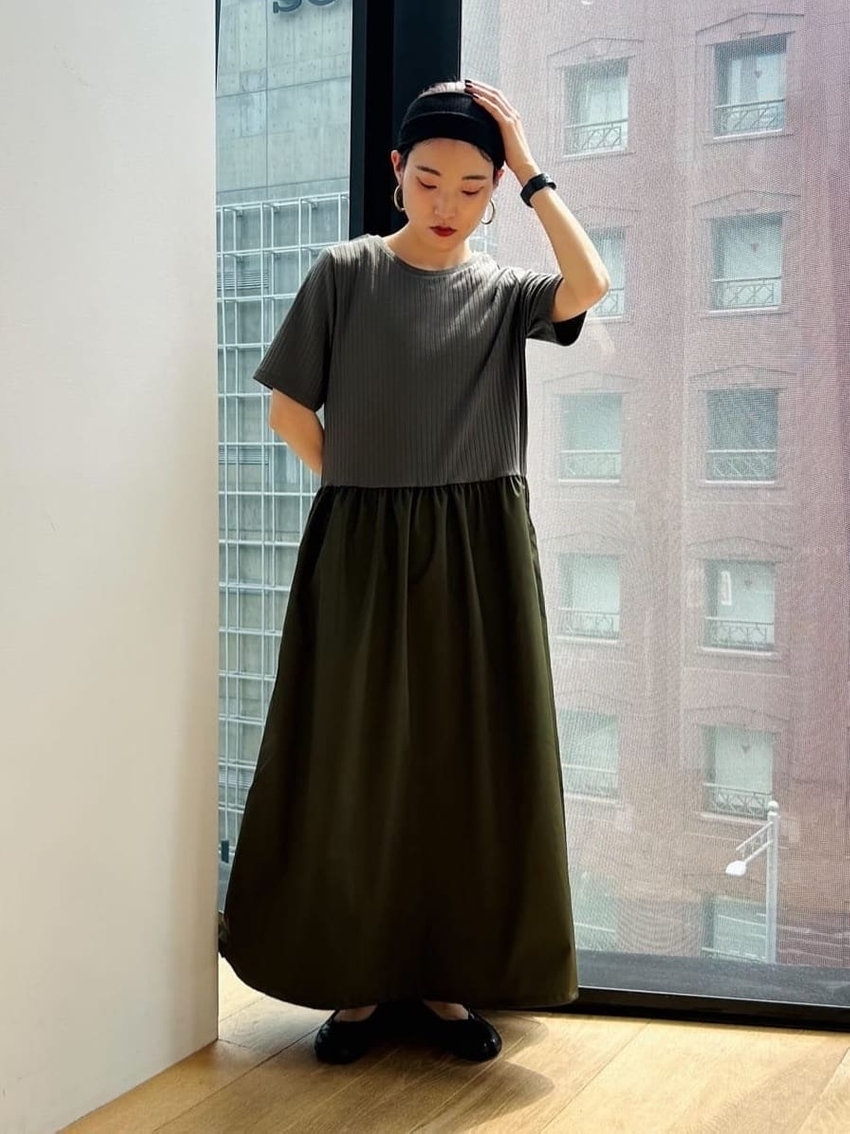 異素材を組み合わせたコンビワンピースが主役のシンプルコーデです。カーキのワントーンで大人っぽく、ギャザー入りのスカートが女性らしい印象を演出します。