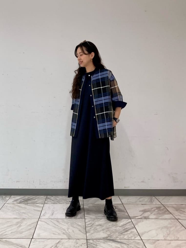 ネイビーのユーロジャージワンピースに、シアー感のあるチェックシャツを羽織ったコーディネートです。