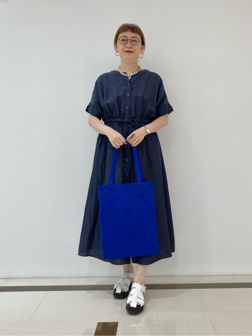 麻混素材のシャリ感が涼しげなネイビーのワンピースに、鮮やかなブルーのトートバッグを合わせた夏のきれいめカジュアルコーデです。