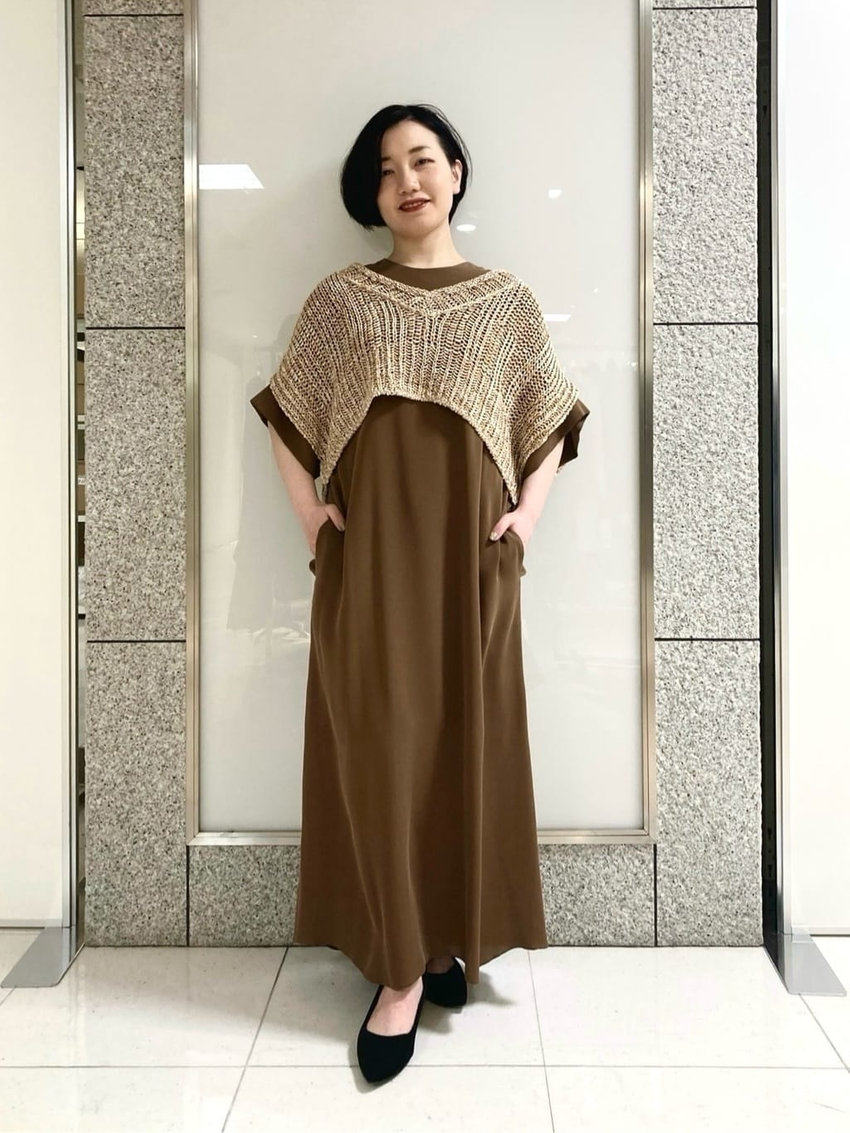 ブラウンのワンピースに、ざっくり編まれたニットジレを重ねたアースカラーのレイヤードコーデです。