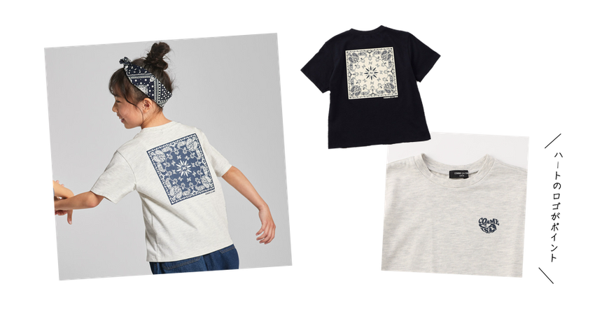 後ろにはバンダナ柄をプリントした、シンプルで新鮮な半袖Tシャツ。