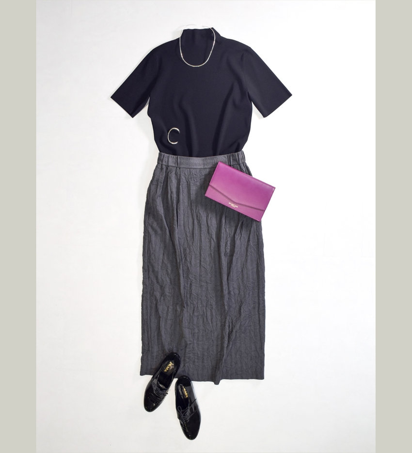 シワを気にせず着られるから毎日のスタイルに自然に馴染むミディ丈スカートには、ミニマルなニットを合わせてエレガントなシティスタイル。パープルのクラッチバッグで色を添えて、品格と軽快さの心地良い調和を表現。