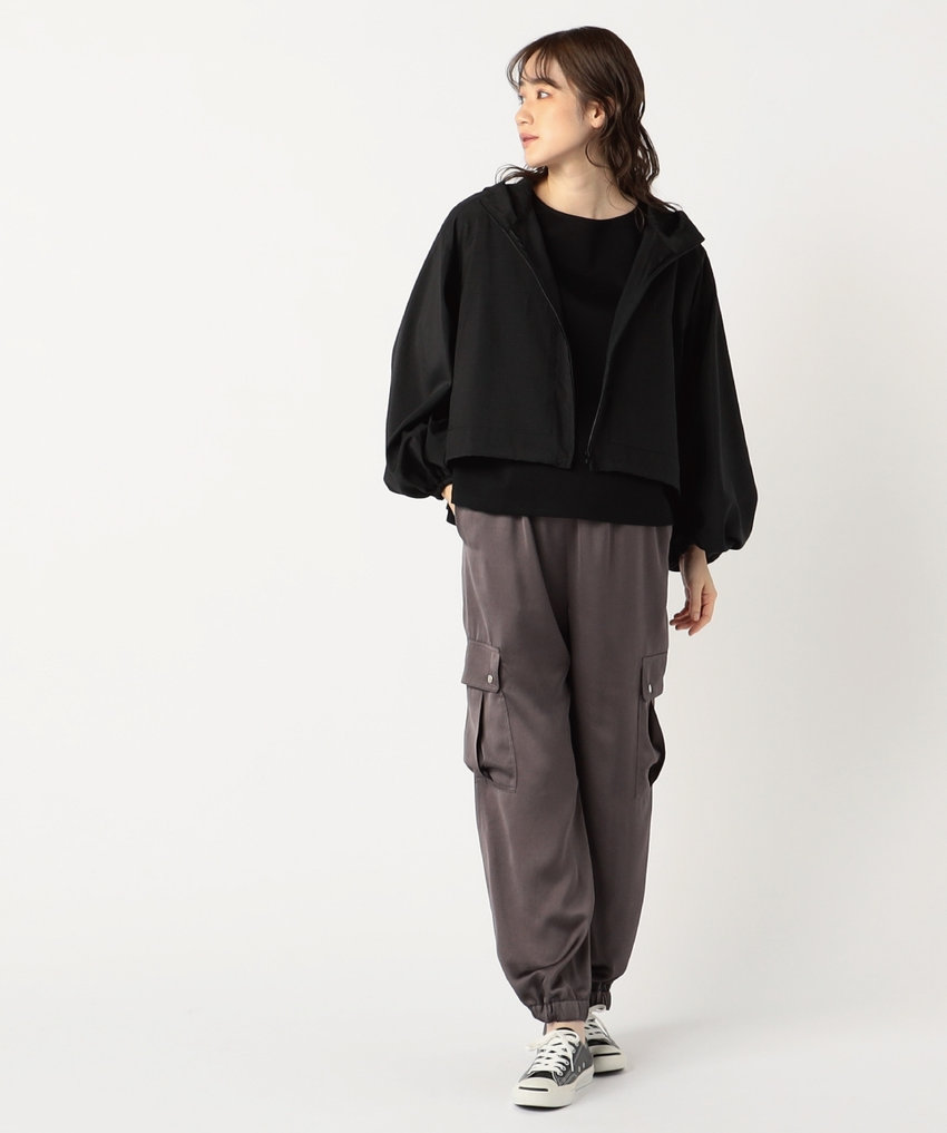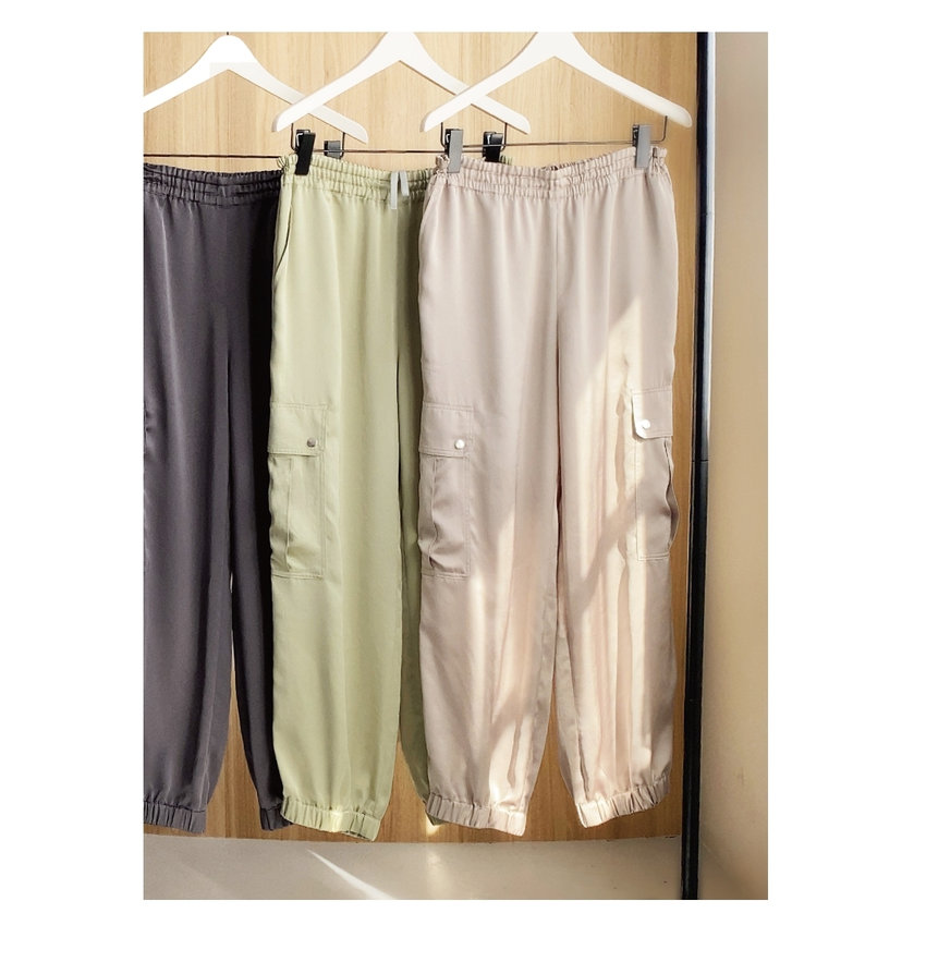 サテンの艶感が上品なカーゴパンツ。
