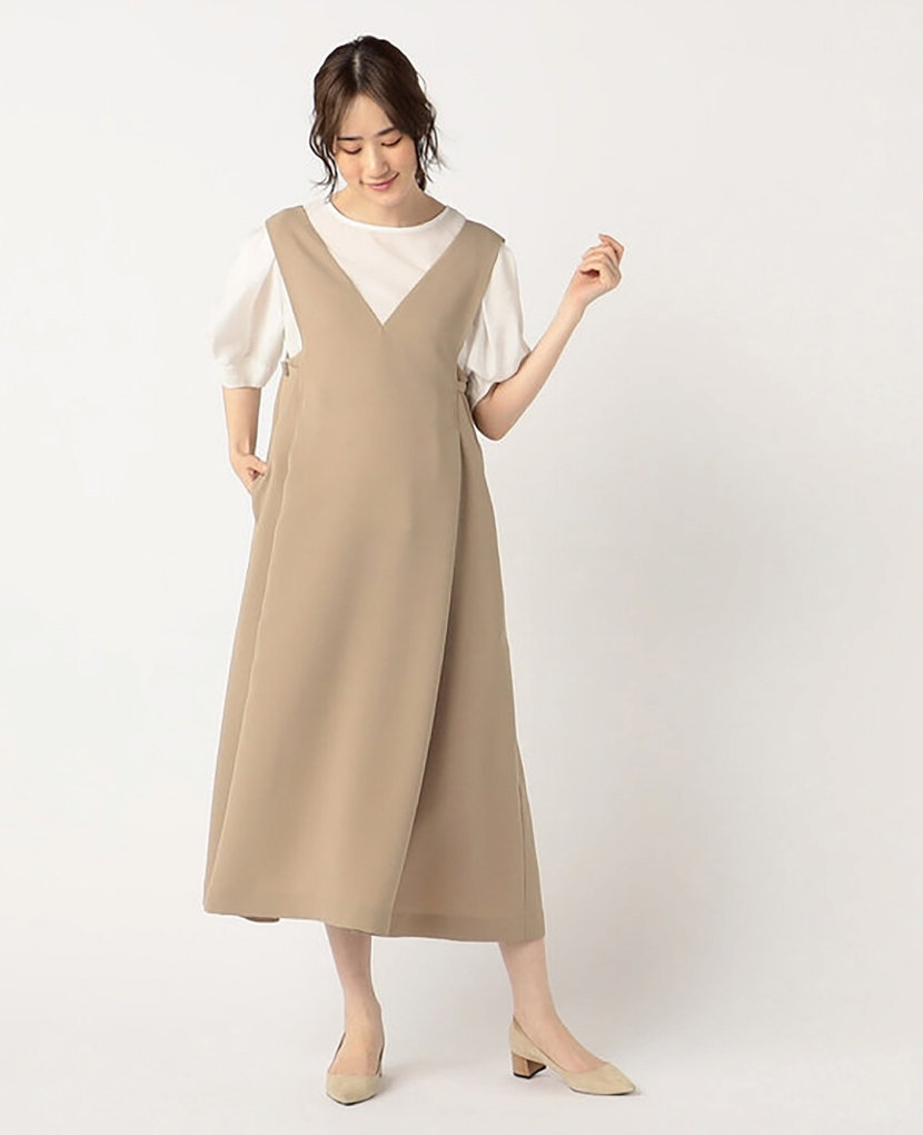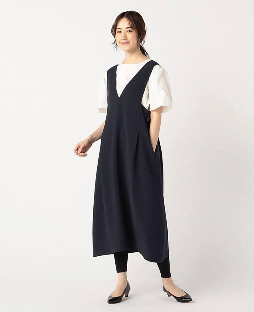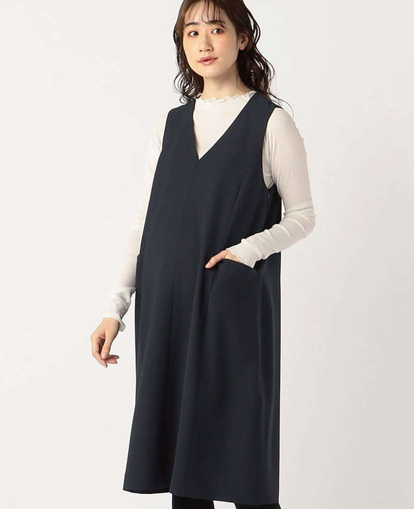 ・上品な深めのVネックでシャープな印象と、タックから広がるAラインシルエットが女性らしいジャンパースカートです。