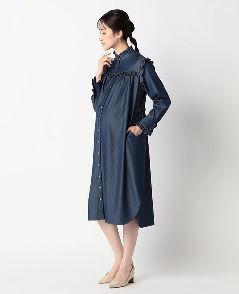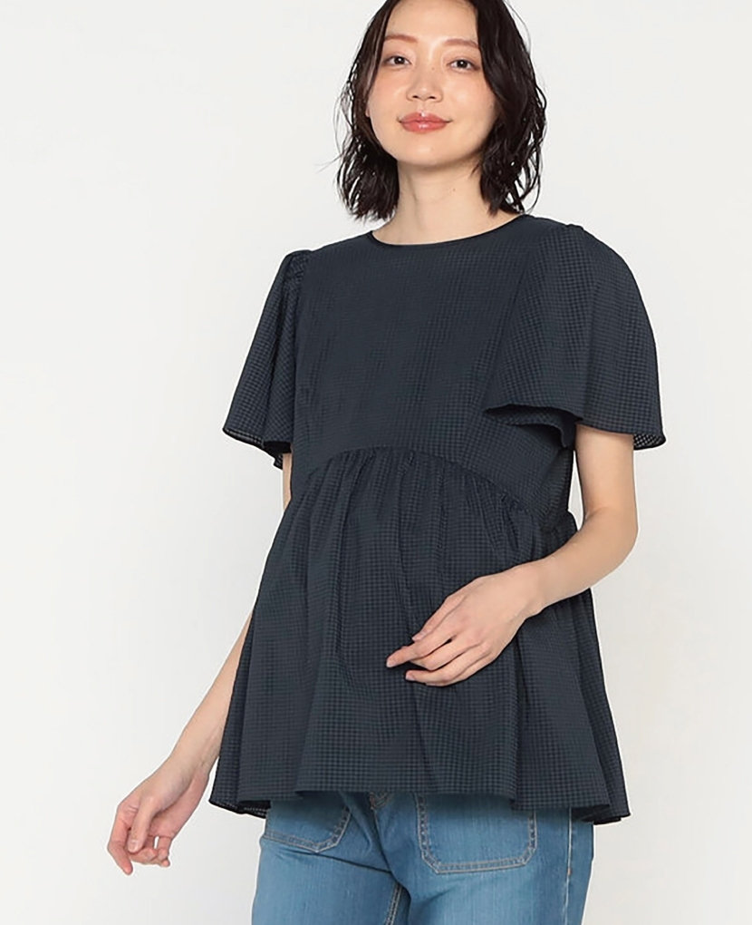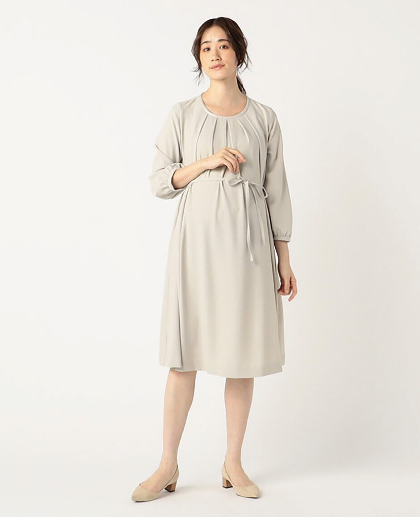 ・フロントタックのデザインは、お腹の大きい時にはフレアーが広がり、産後はウエストマークのリボンでスッキリ着用出来ます。