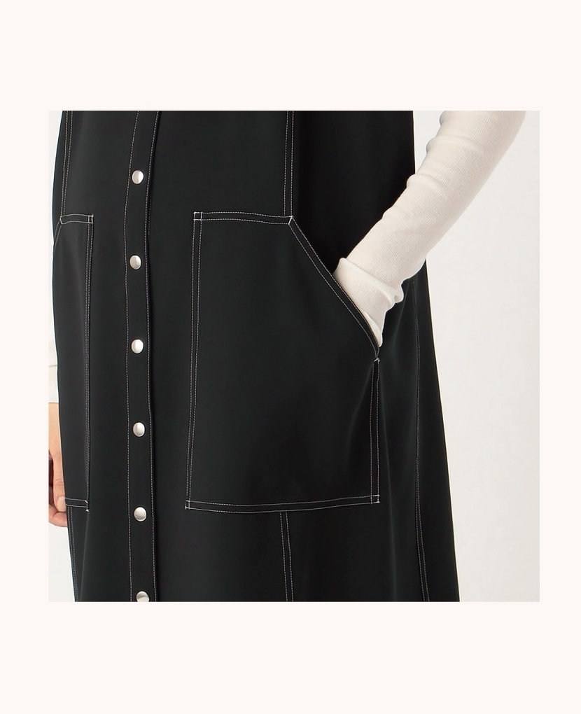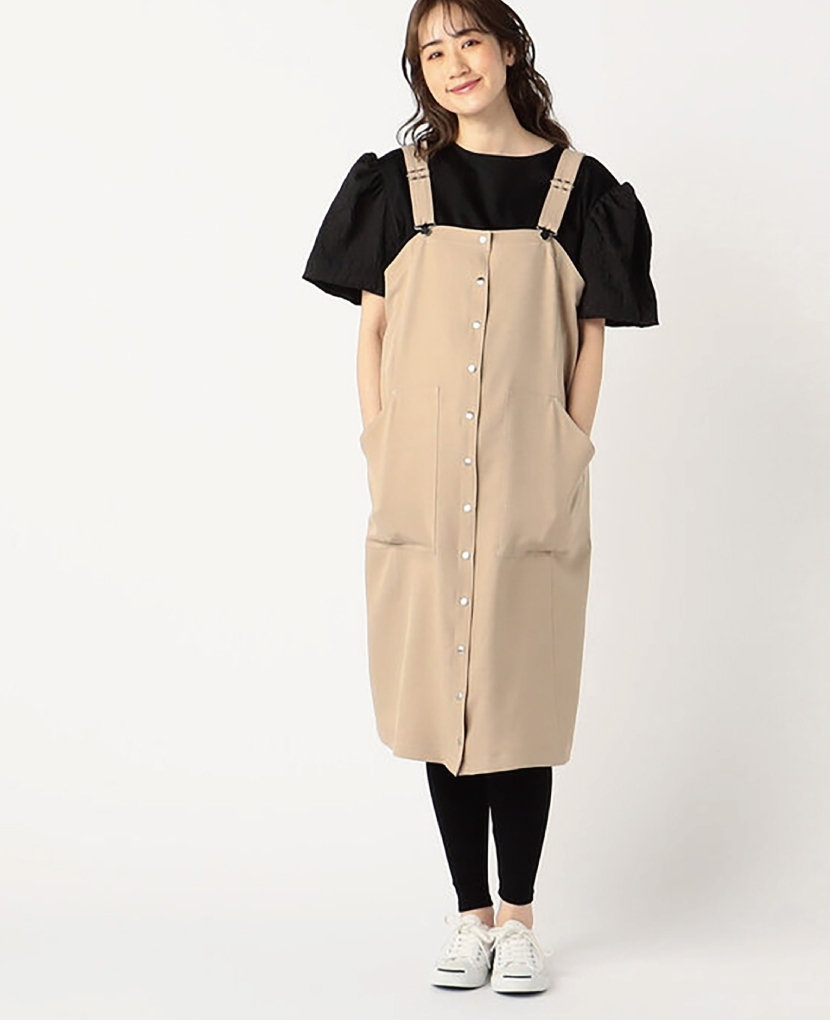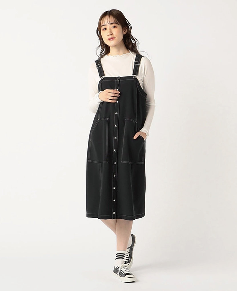 ・滑らかなタッチのストレッチ素材で、配色ステッチとドットボタンがポイントのサロペットスカートです。