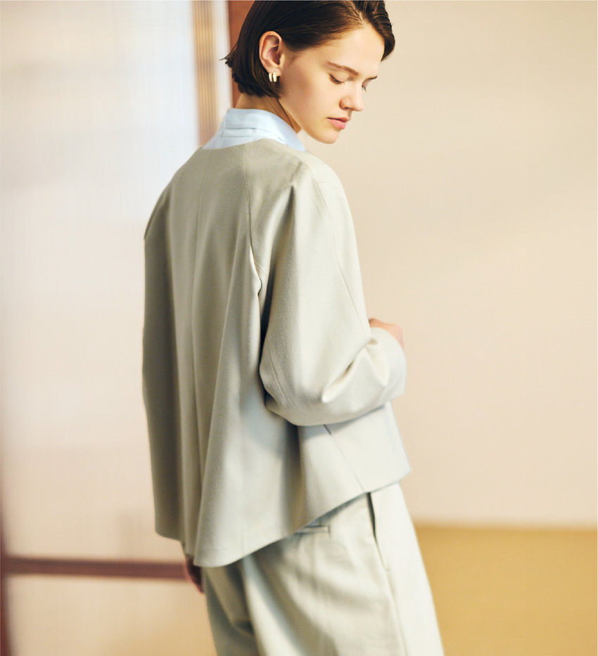 ノーカラーでブルゾンっぽくも着られるジャケット。テーラードジャケットが苦手な小柄な方にも着こなしやすいデザイン。ほんのり丸みを帯びたシルエットと優しい色合いで、全く印象の異なるセットアップスタイルに。