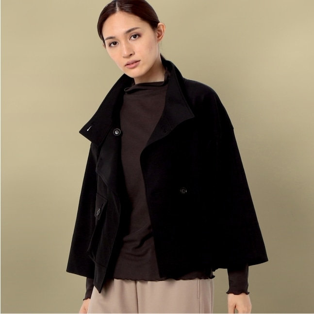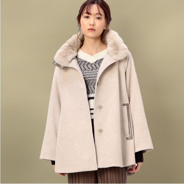 - Aラインショートコートは、フード風の襟を開けて大きめの襟にしたり、閉めてスタンド風にすることができます。顔まわりのファーはエレガントを醸します。