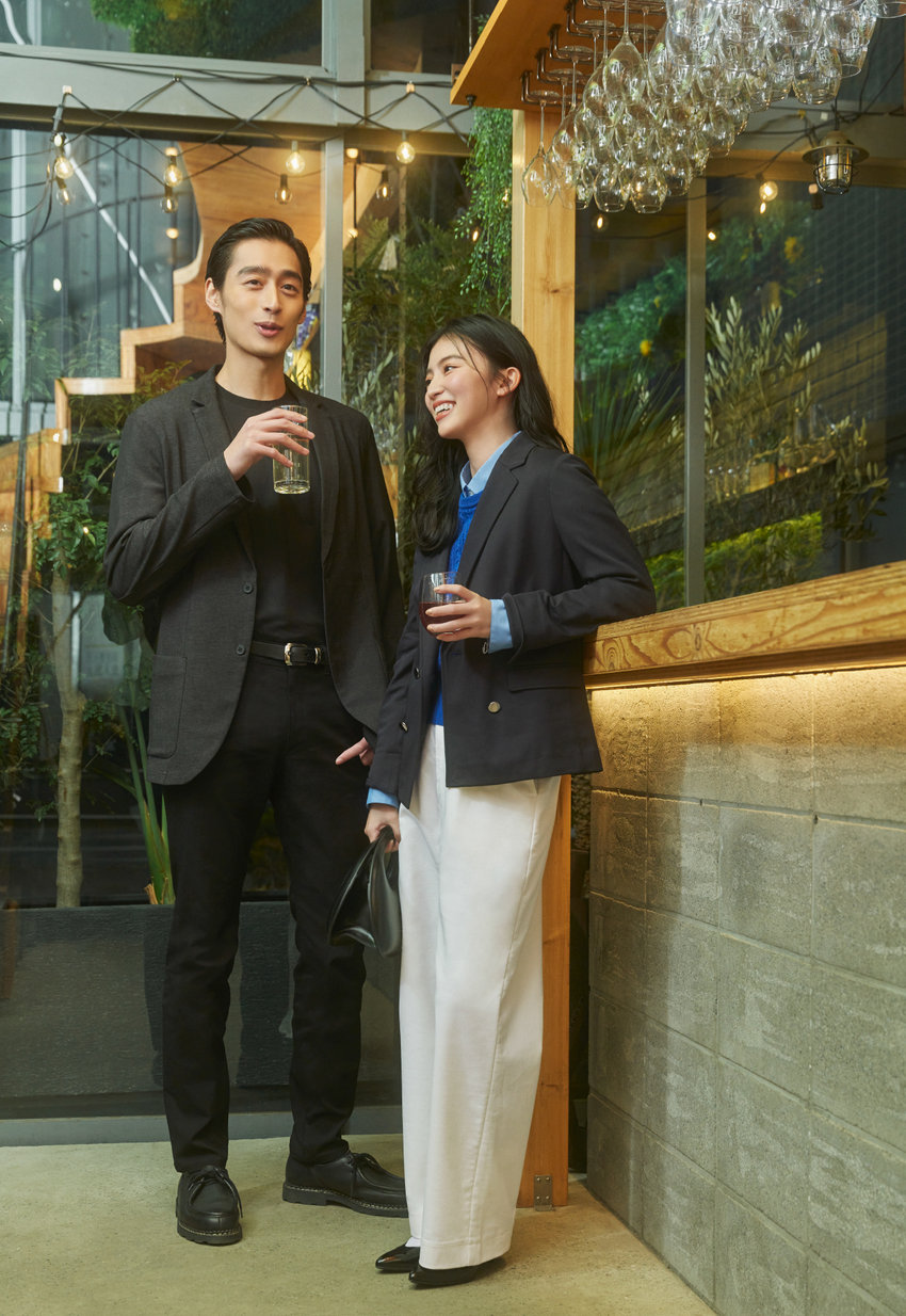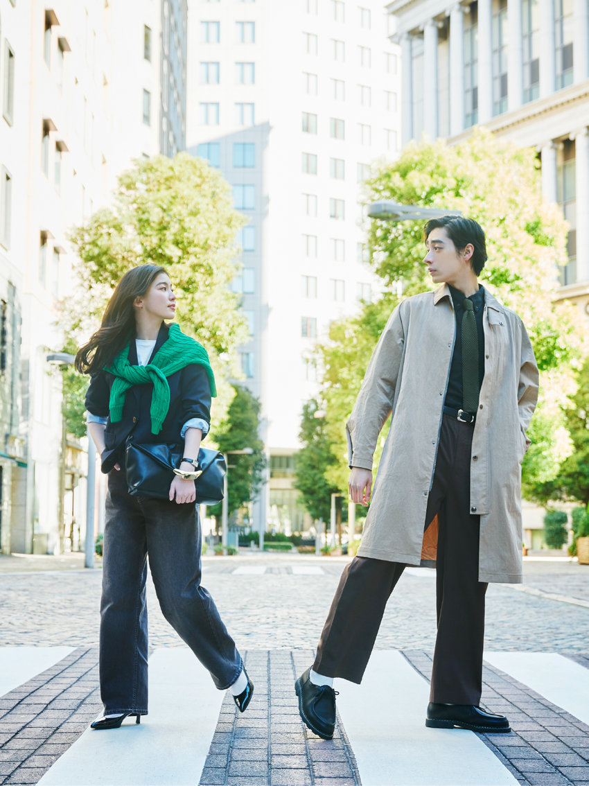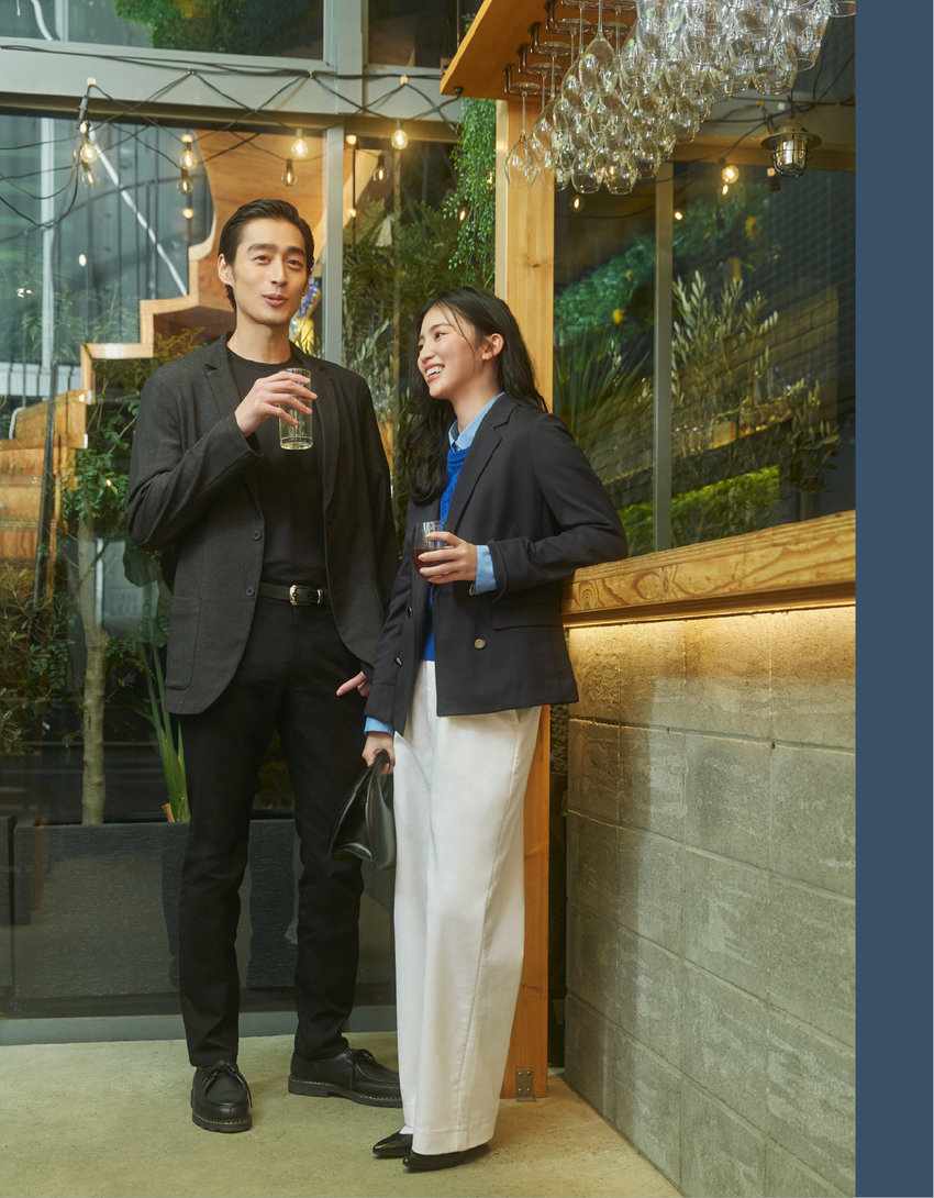 仕事後のディナーは、知的なジャケットスタイルで。彼はデニムライクなテーラードにスキニーでシックにまとめて、どこか余裕がある装いに。彼女はダブルブレストにブルーのニットを効かせ、チノパンで程よくドレスダウン。力みないふたりの佇まいが、特別な時間を演出。