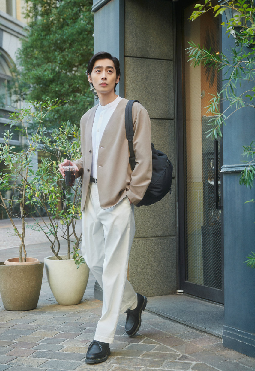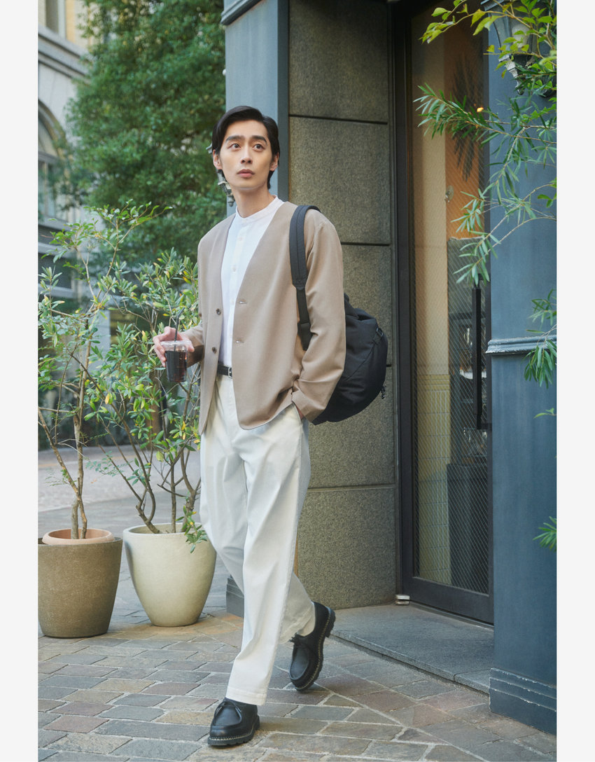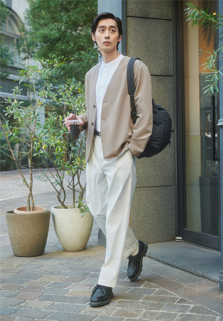 オフィスへ向かう朝は、スーツライクなノーカラージャケットできれいめオフィスカジュアルに。ストレッチツイル素材は肌触り良く、ストレスフリーな着心地でラフに羽織ってもきちんと見え。バンドカラーシャツとワイドパンツで、清涼感を保ちながらも端正に仕上げて。