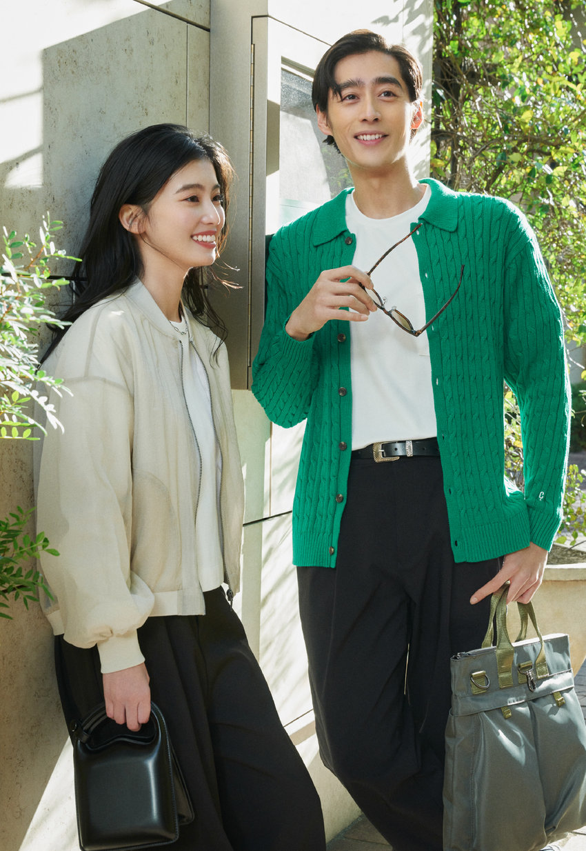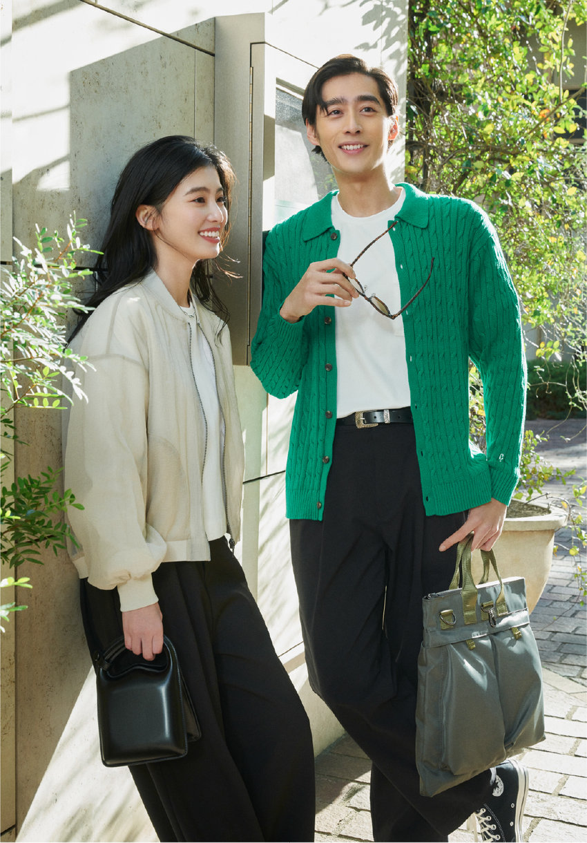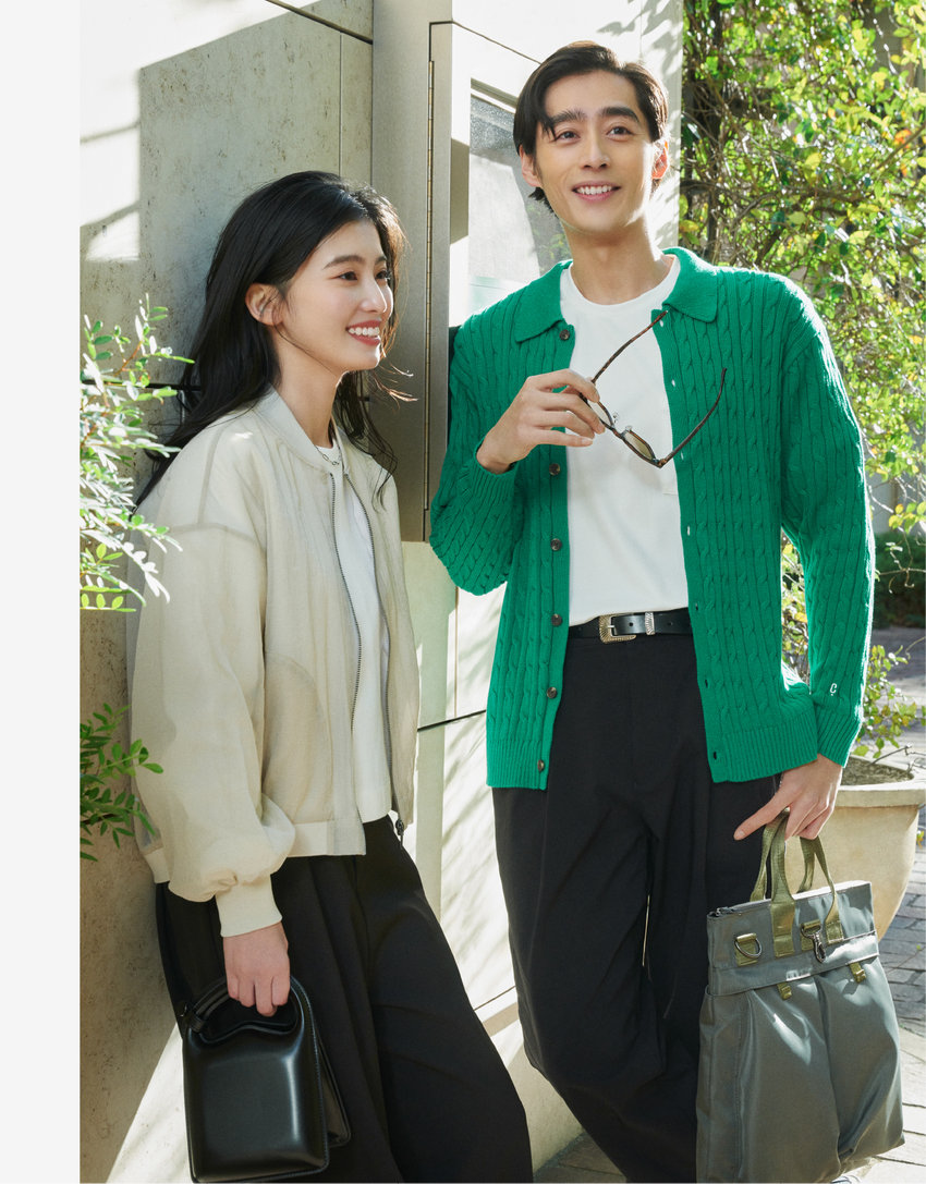 アクティブな休日には、定番の白T×ワイドパンツで動きやすく。彼は鮮やかなグリーンが目を惹く襟つきカーデを合わせて、品よくカジュアルダウン。彼女はオーバーサイズのシアーMA-1でほんのり透ける上品な抜け感を。トレンドアウターで休日カジュアルを一新。