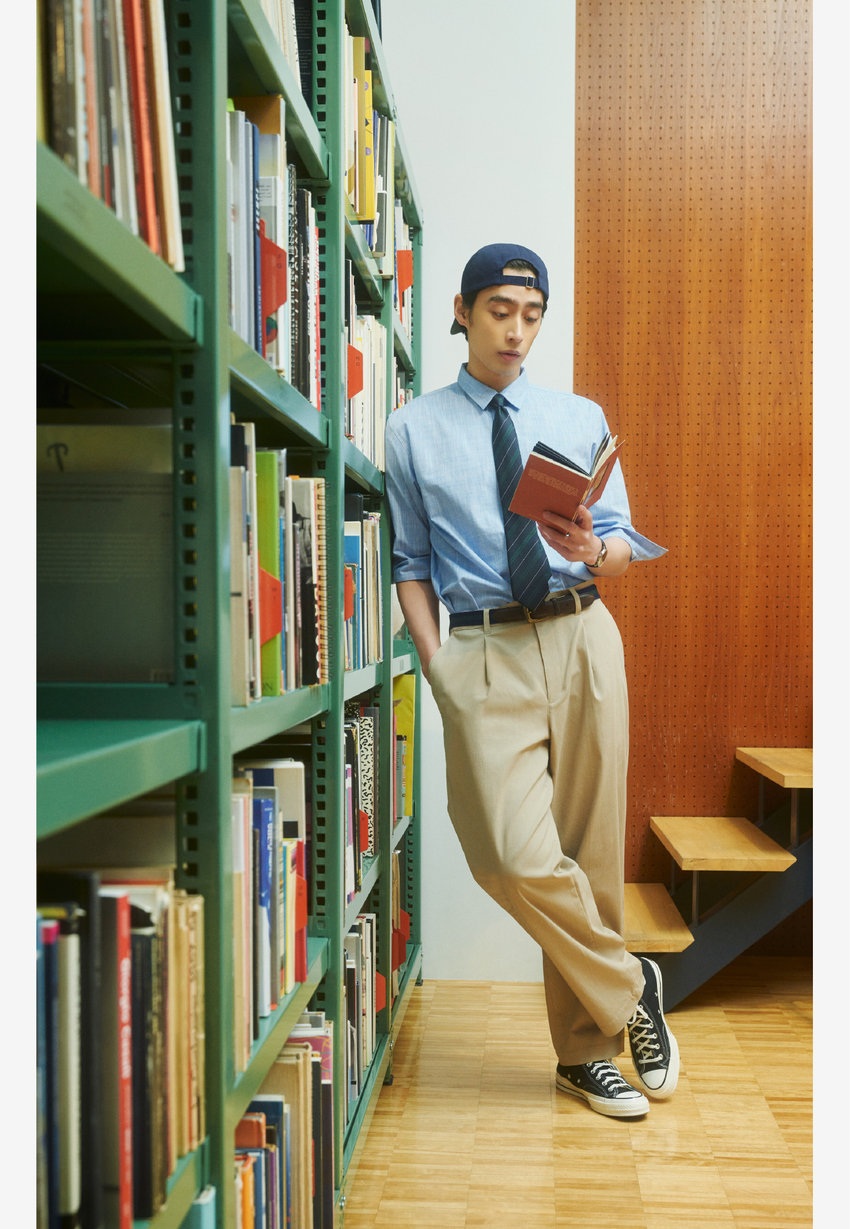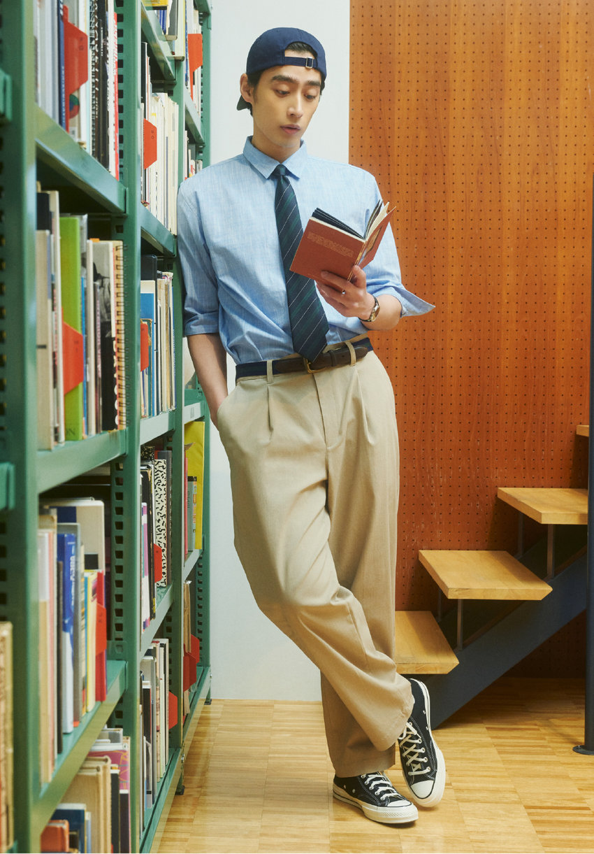今どきアイビートラッドで、気になっていた本屋さんを巡る日もこなれ感のある雰囲気に。さらりとしたリネン混シャツと、しなやかに体に沿うワイドテーパードパンツで快適さも申し分なし。トレンド感のあるキャップとレジメンタイで遊び心を加えて。
