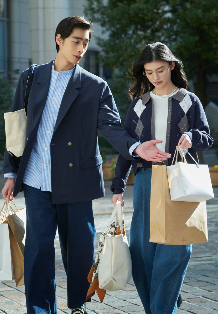 街へのショッピングは、2人ともデニムで軽快に。ゆったりジャケットにシャツを忍ばせたトラッドな彼と、アーガイルカーディガンにワイドデニムでバランスよくまとめた彼女。上品なネイビーでトーンを揃えて、2人きりの休日をチアフルに過ごそう。