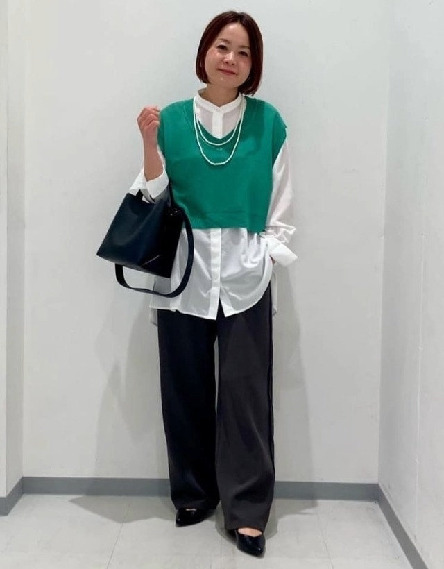 長めのシャツ×短めニットベストで