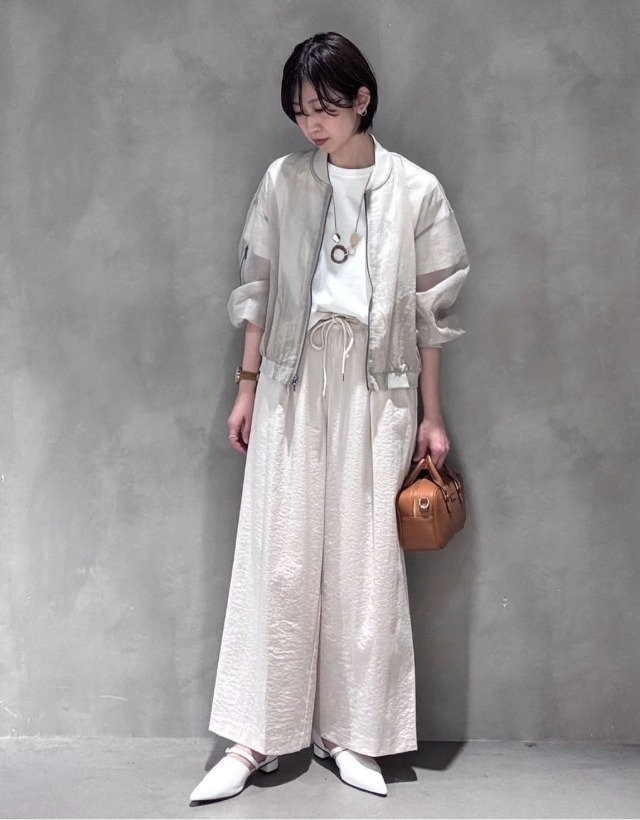 コンパクト丈のブルゾンとワイドパンツのバランスで、