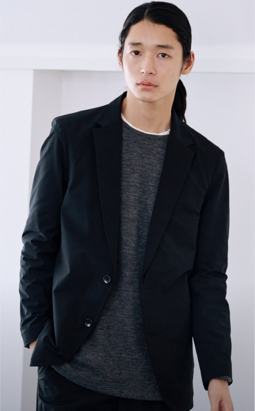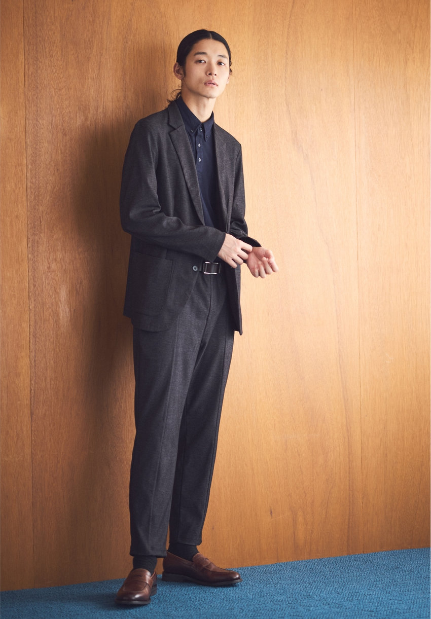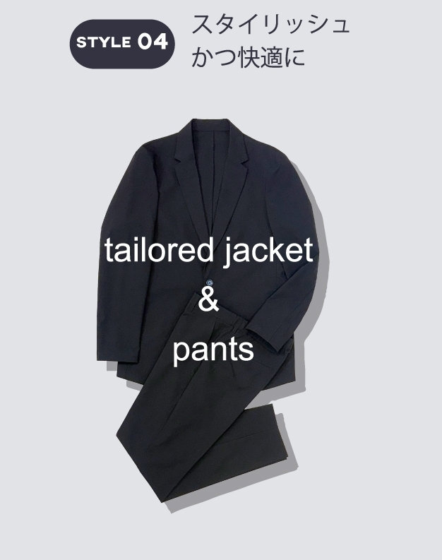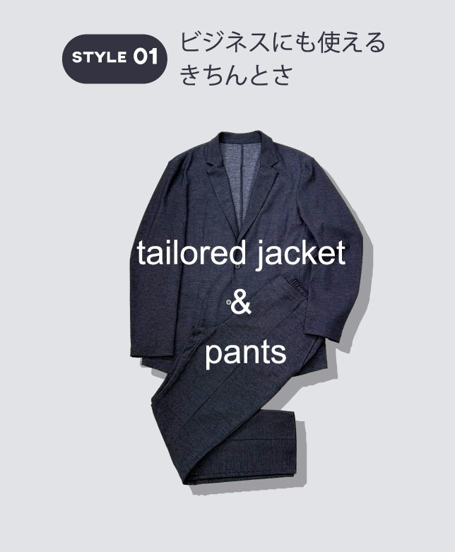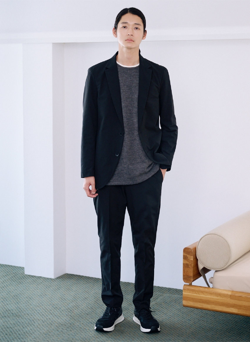 高いストレッチ性で、着心地良く。心地よく過ごせて、かつスタイリッシュに。スマートであっても無理はしない。イージータイプのジャケットは、さらっとカーディガン感覚で羽織れる。パンツはセンタープレス入りで上品な印象のテーパードシルエット。アクティブな中にも、きちんとした上品さのあるスタイル。