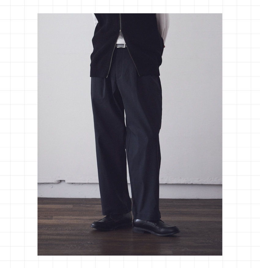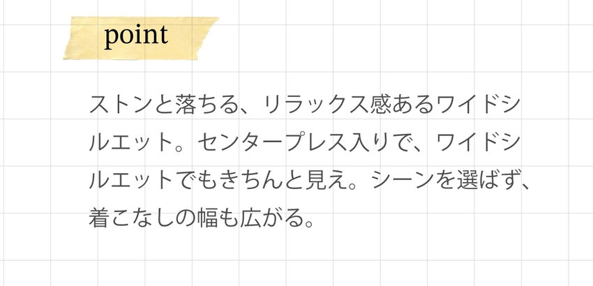 ストンと落ちる、リラックス感あるワイドシルエット。センタープレス入りで、ワイドシルエットでもきちんと見え。シーンを選ばず、着こなしの幅も広がる。