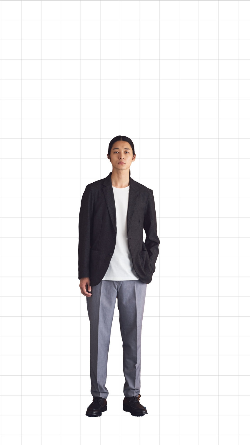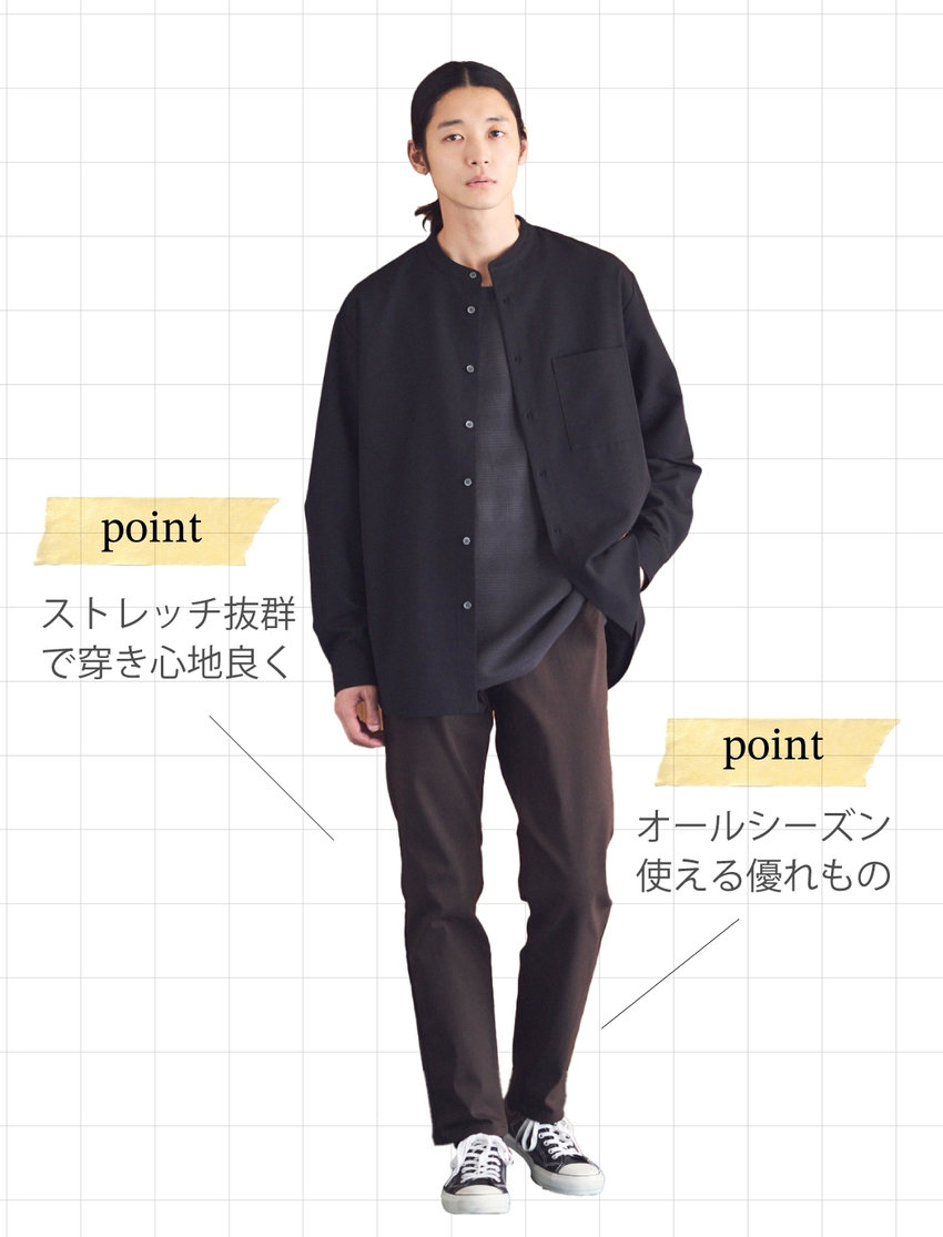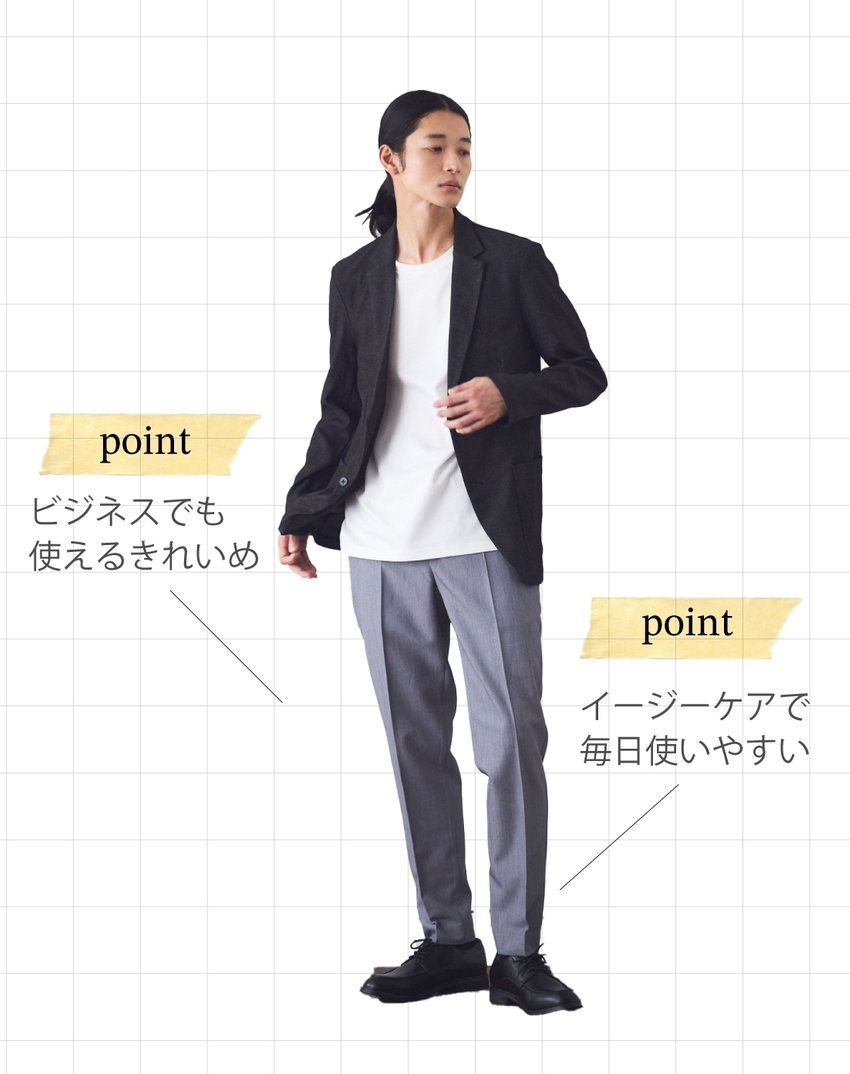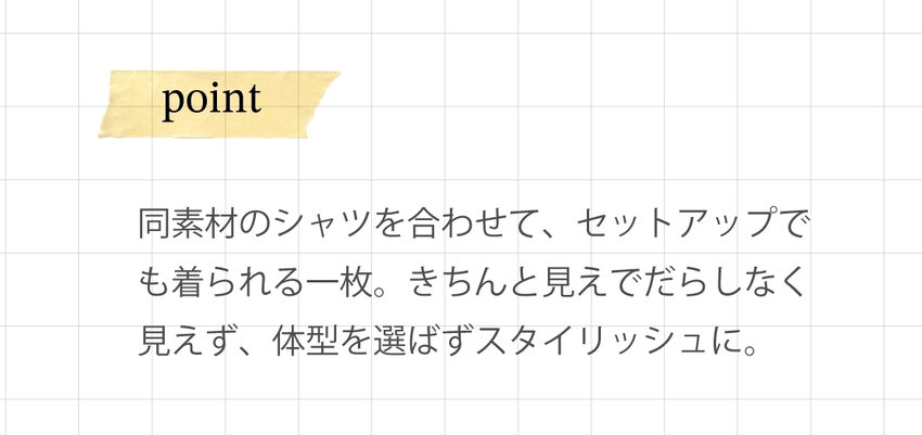 同素材のシャツを合わせて、セットアップでも着られる一枚。きちんと見えでだらしなく見えず、体型を選ばずスタイリッシュに。