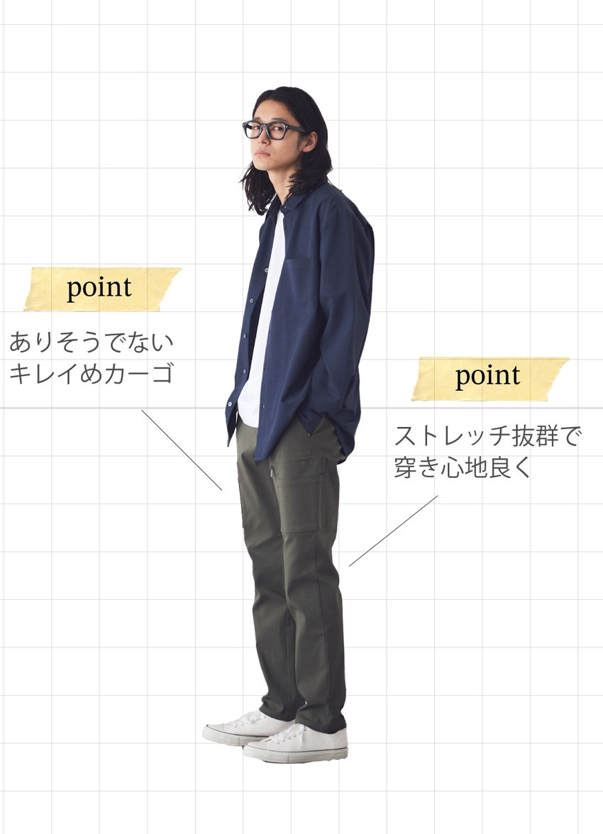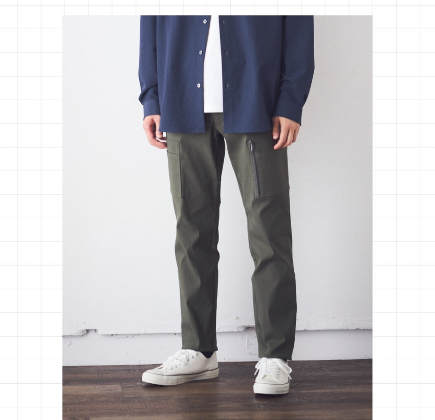 カジュアルになりがちなカーゴパンツを、キレイめに仕上げた一枚。マチ無しのスッキリとしたカーゴポケットの片側にファスナーをつけてアクセントに。ハードになり過ぎず、スタイリングの幅も広がるデザイン。