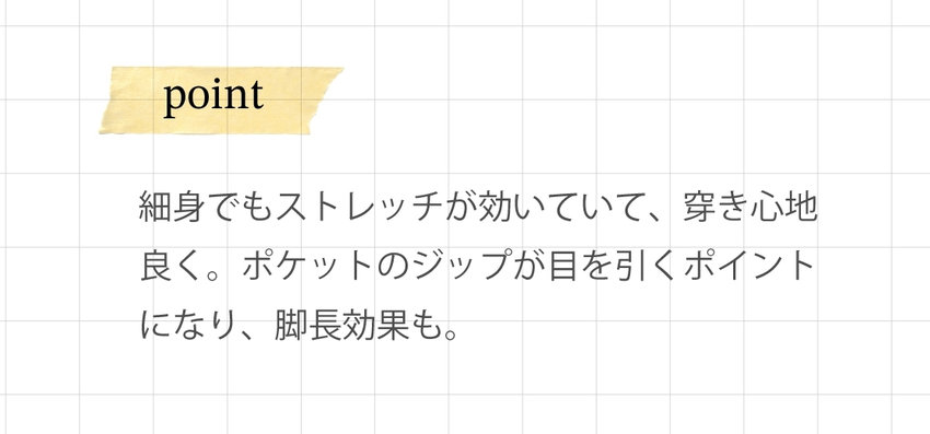 細身でもストレッチが効いていて、穿き心地良く。ポケットのジップが目を引くポイントになり、脚長効果も。