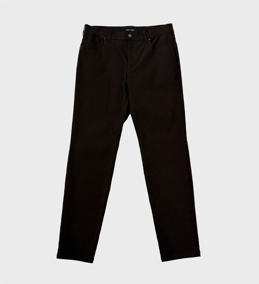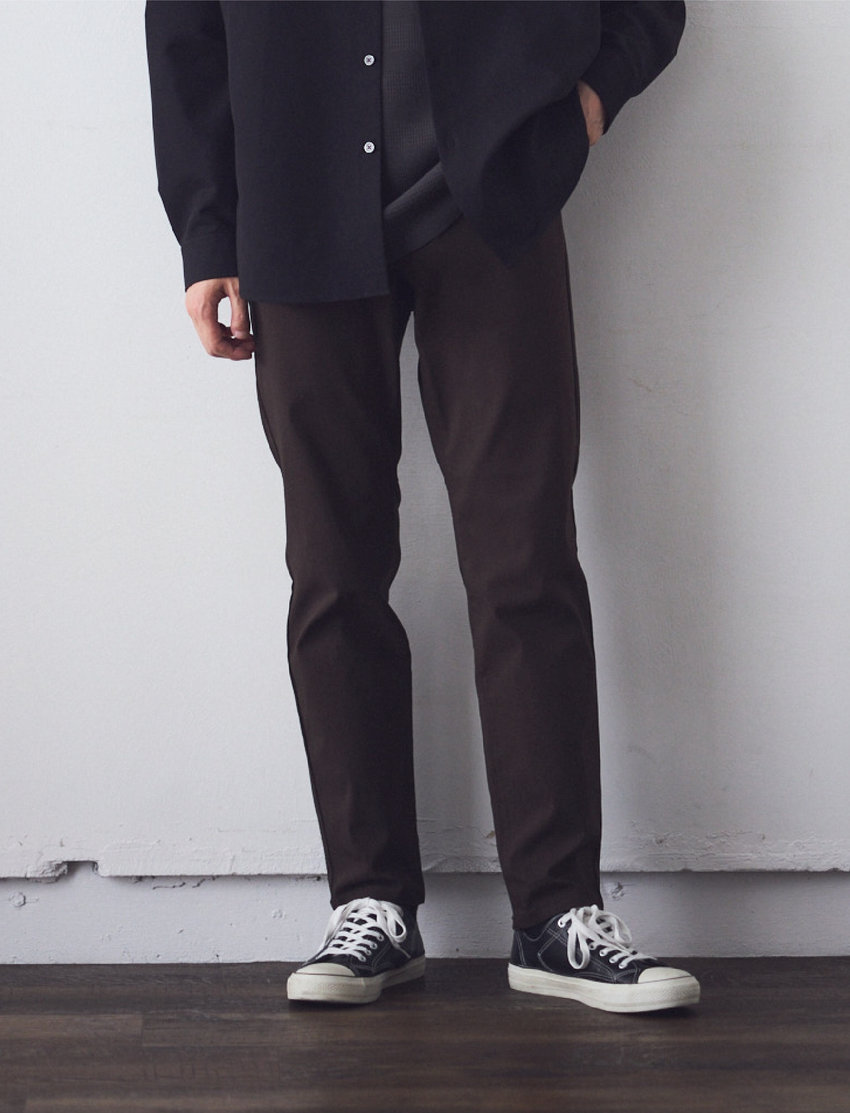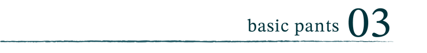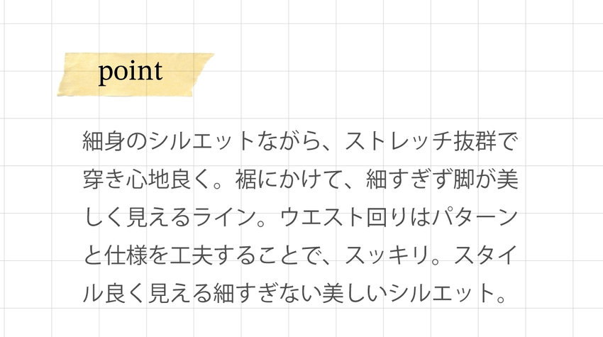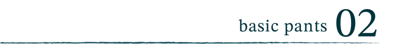 細身のシルエットながら、ストレッチ抜群で穿き心地良く。裾にかけて、細すぎず脚が美しく見えるライン。ウエスト回りはパターンと仕様を工夫することで、スッキリ。スタイル良く見える細すぎない美しいシルエット。