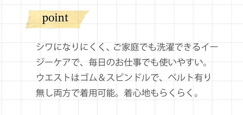 シワになりにくく、ご家庭でも洗濯できるイージーケアで、毎日のお仕事でも使いやすい。ウエストはゴム&スピンドルで、ベルト有り無し両方で着用可能。着心地もらくらく。