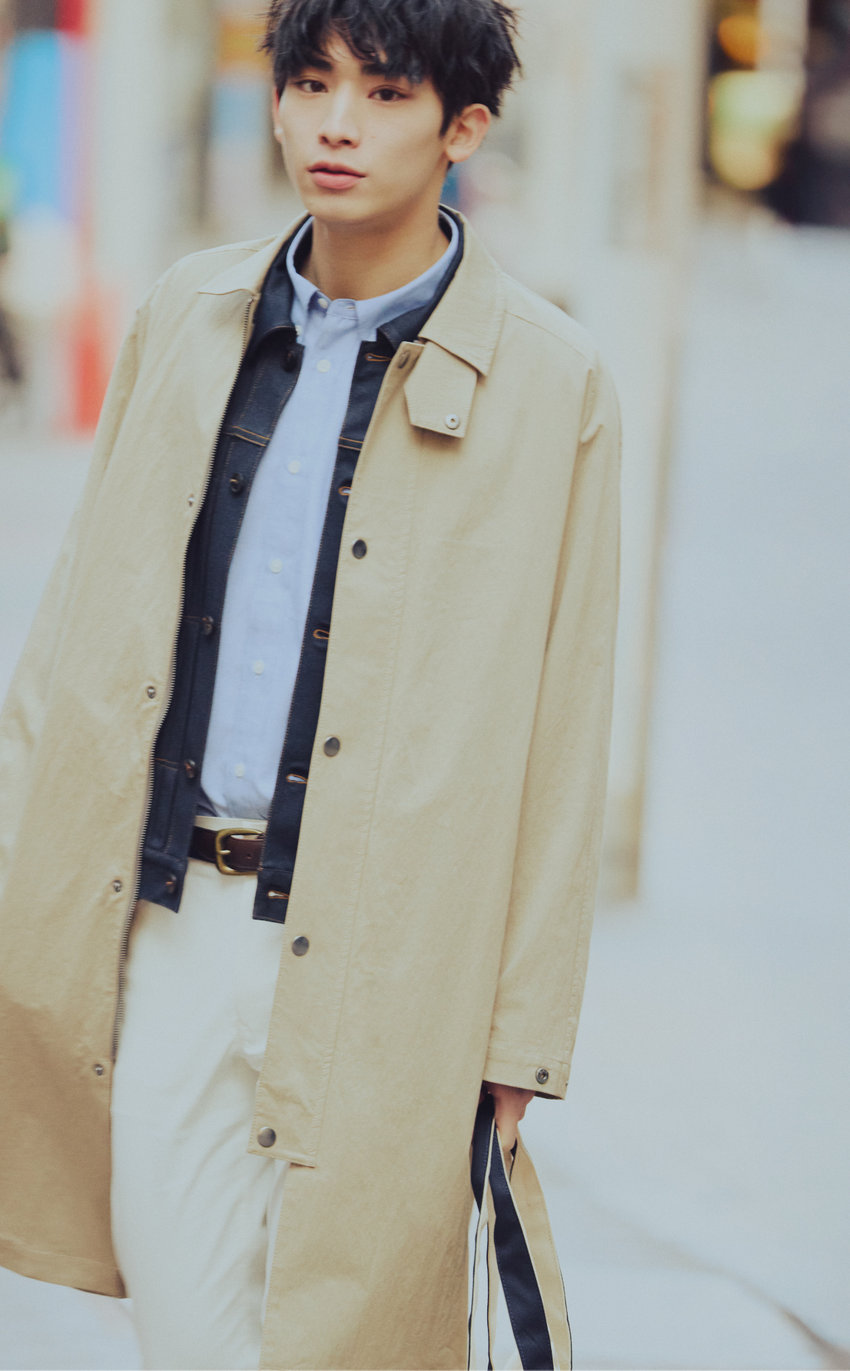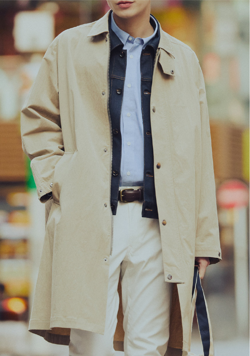 春に適した薄手のデニムライク素材ステンカラーコート。ゆとりのあるシルエットや、吸湿性・通気性に優れた軽い素材感を活かした、リラックス感のあるコート。