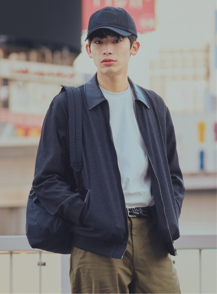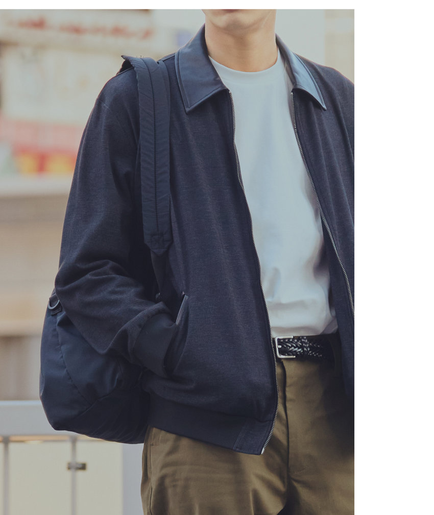 MA-1のシルエットをイメージしたジップアップブルゾン。襟とポケット口は合成皮革を使用してデザインポイントに。デニムのような見た目のストレッチ素材で、着心地も抜群。