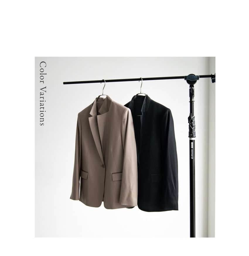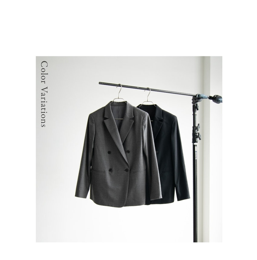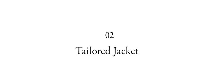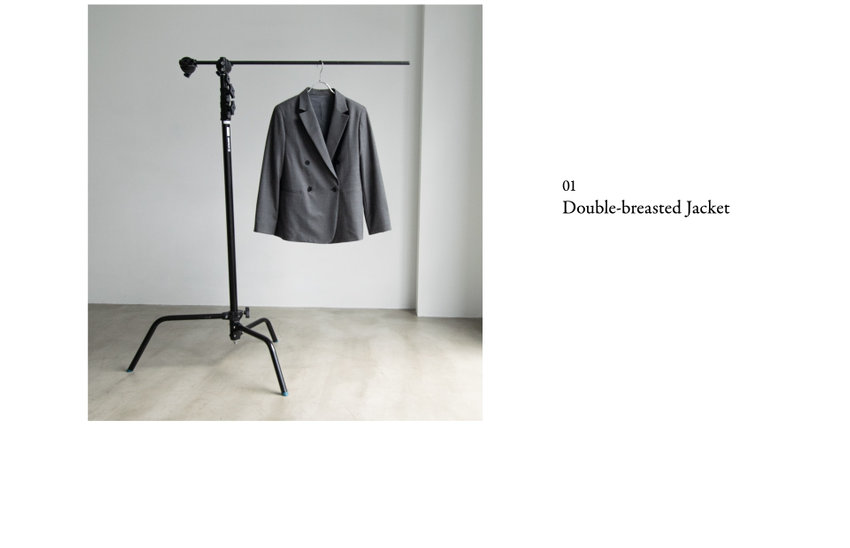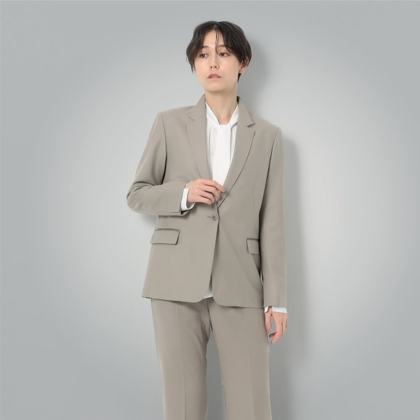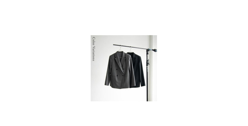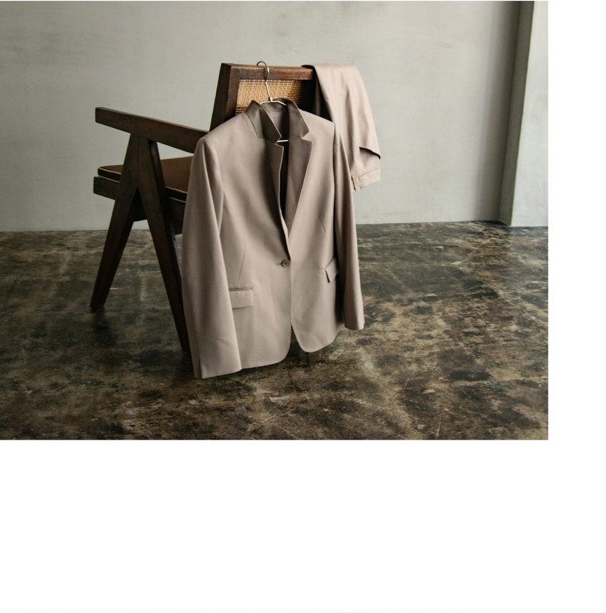 羽衿の外側に合革を使用した、マスキュリンなイメージのスタンドテーラードジャケットを、軽くしなやかなフラノで柔らかな印象に。着丈が長めのテーラードジャケットと細身のパンツで辛口なスーツスタイルがきまる。
