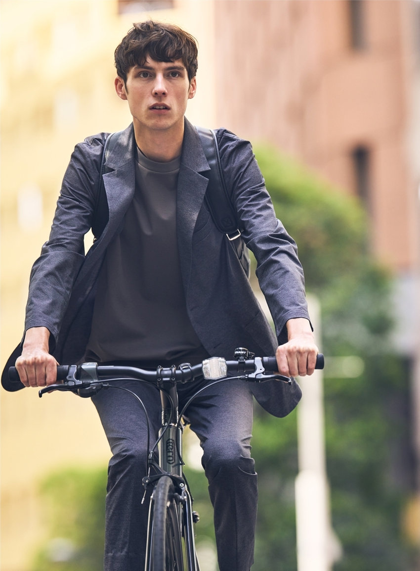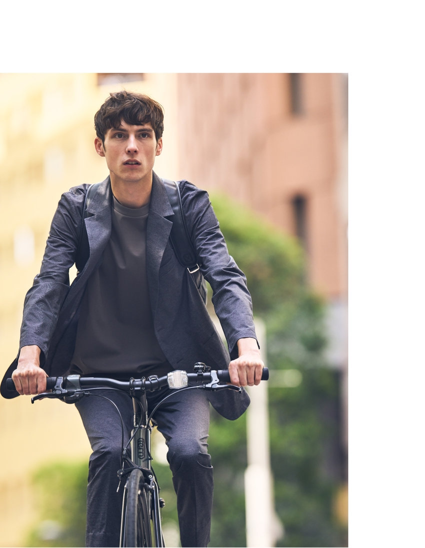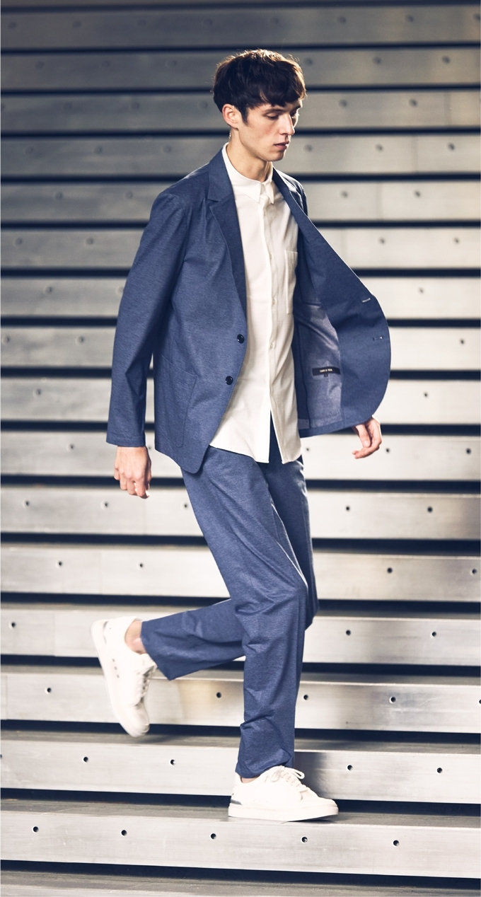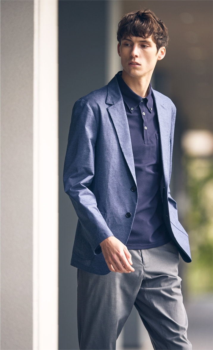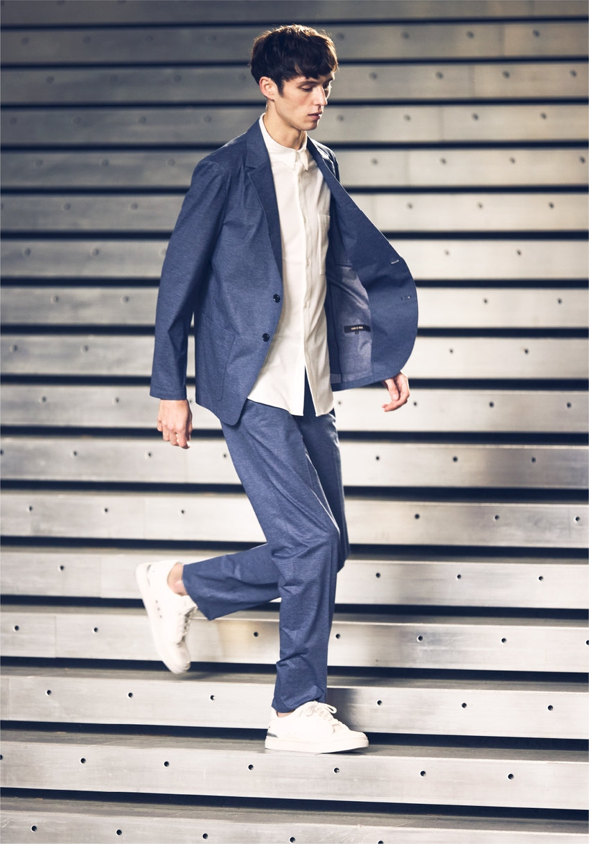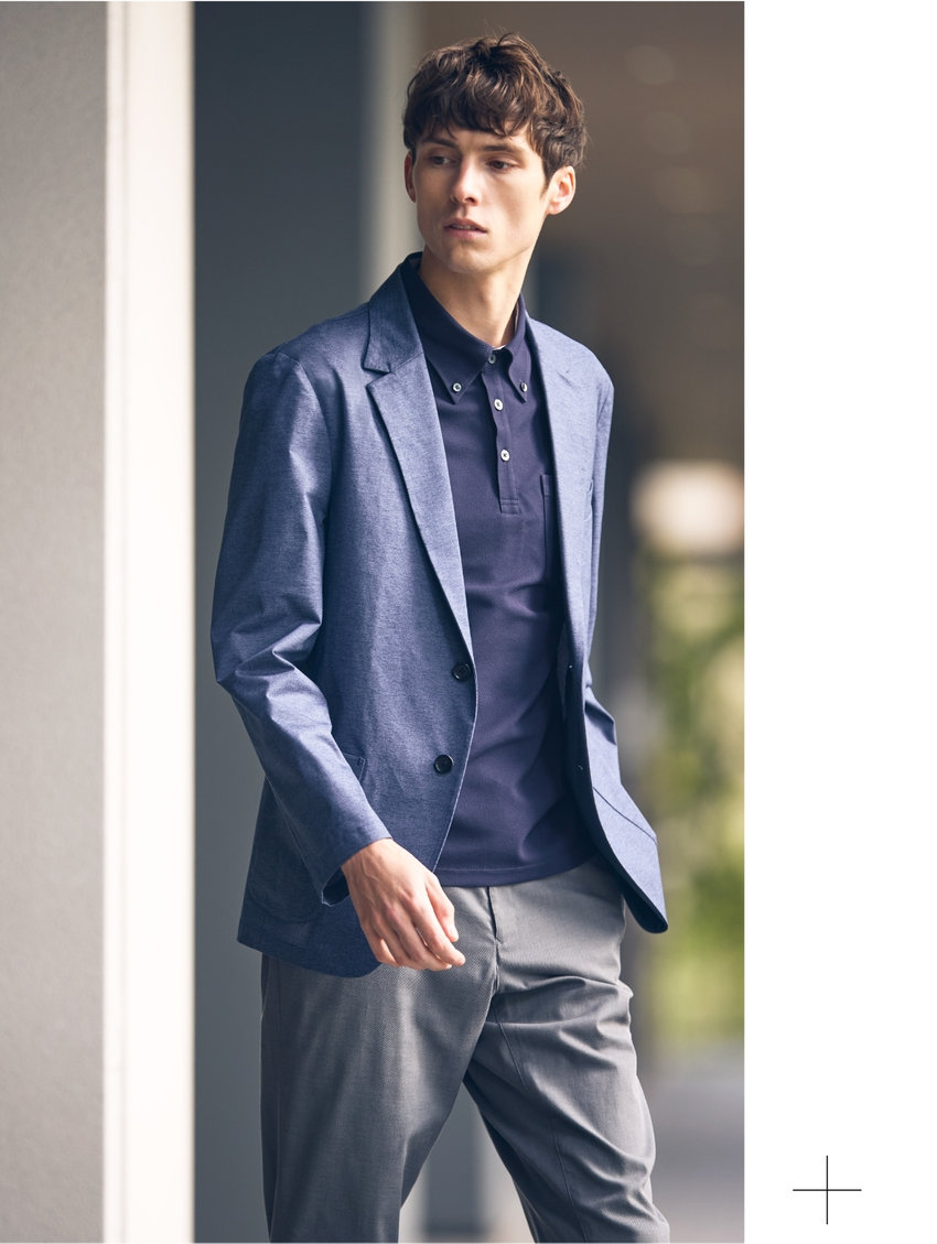 高機能スポーツ素材に、デニム調のプリントを施した、快適な着心地でスマートに見える、オフィスカジュアルにも最適なセットアップ。裏地や肩パットをなくし、芯地も極力なくした軽い仕立て。ウォッシャブル&防シワ、イージーケアで毎日の通勤も軽やかに。