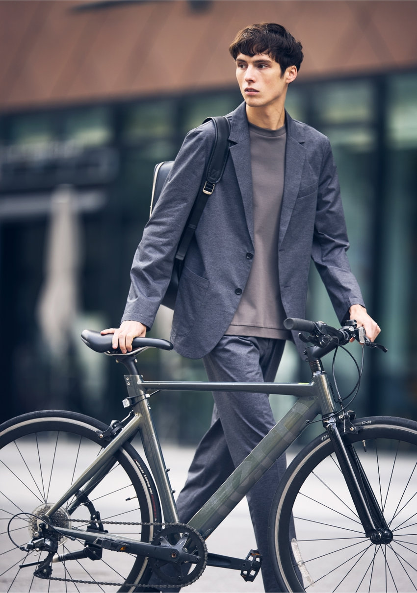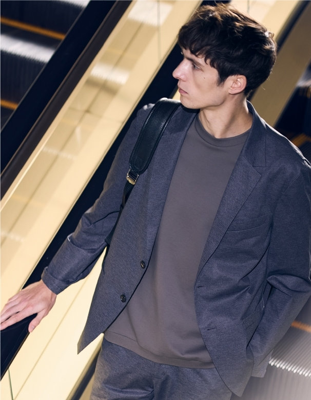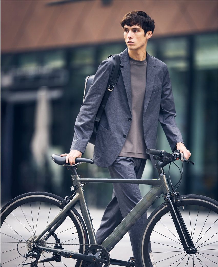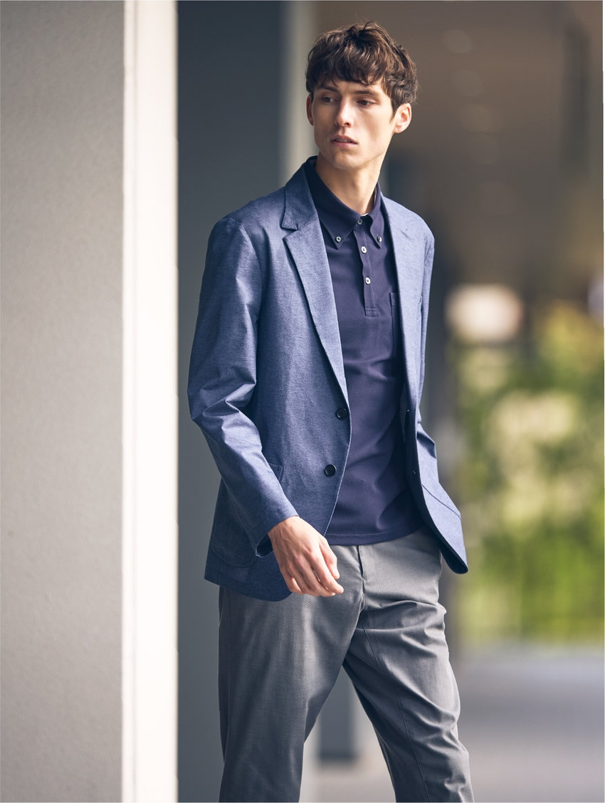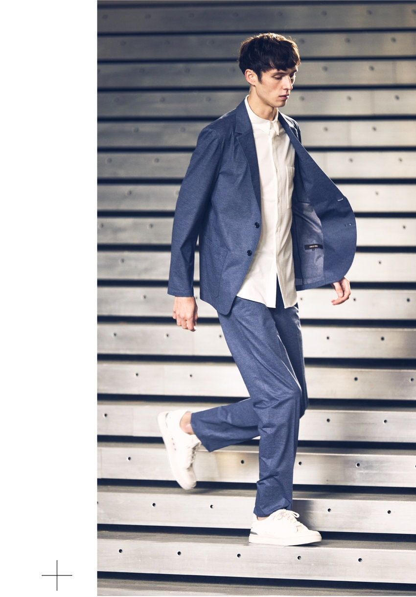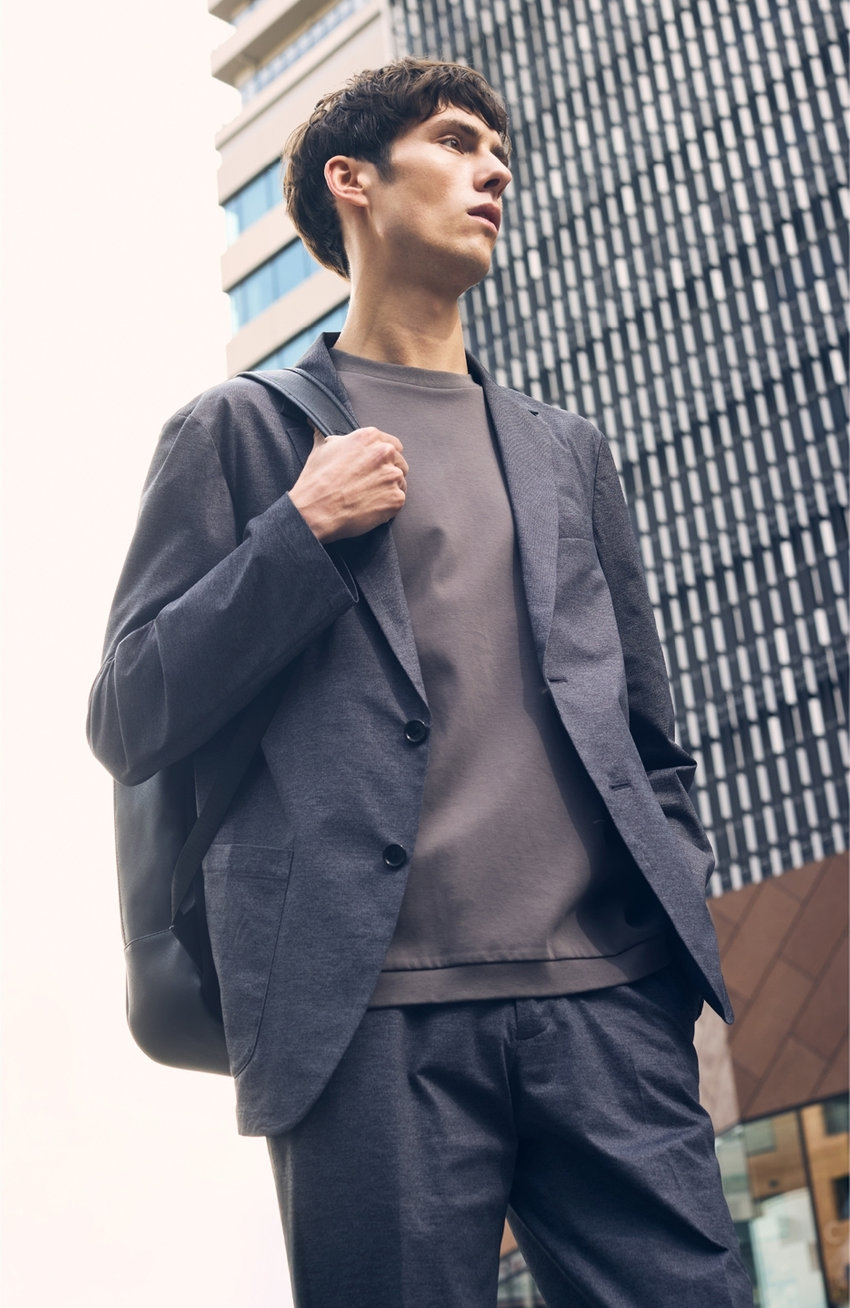 高機能スポーツ素材に、デニム調のプリントを施した、快適な着心地でスマートに見える、オフィスカジュアルにも最適なセットアップ。裏地や肩パットをなくし、芯地も極力なくした軽い仕立て。ウォッシャブル&防シワ、イージーケアで毎日の通勤も軽やかに。