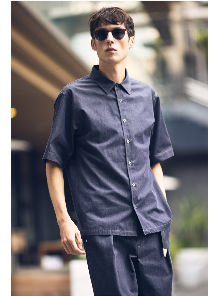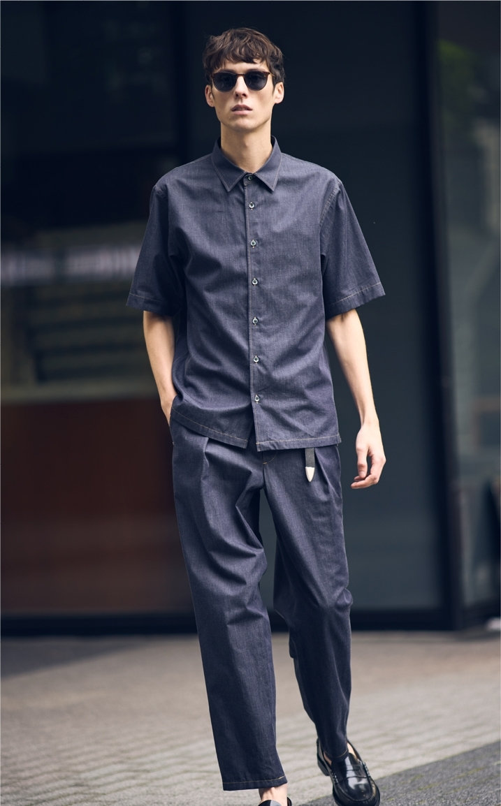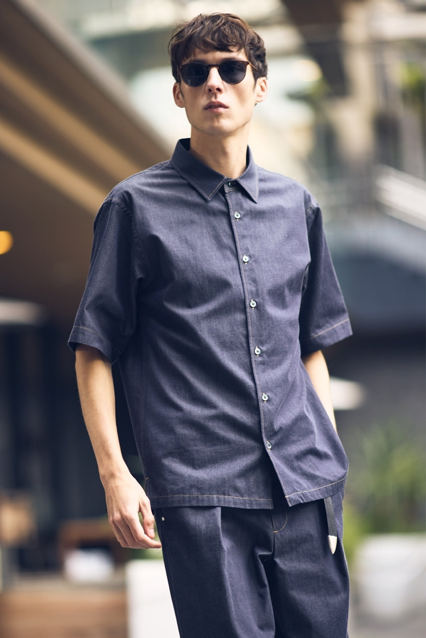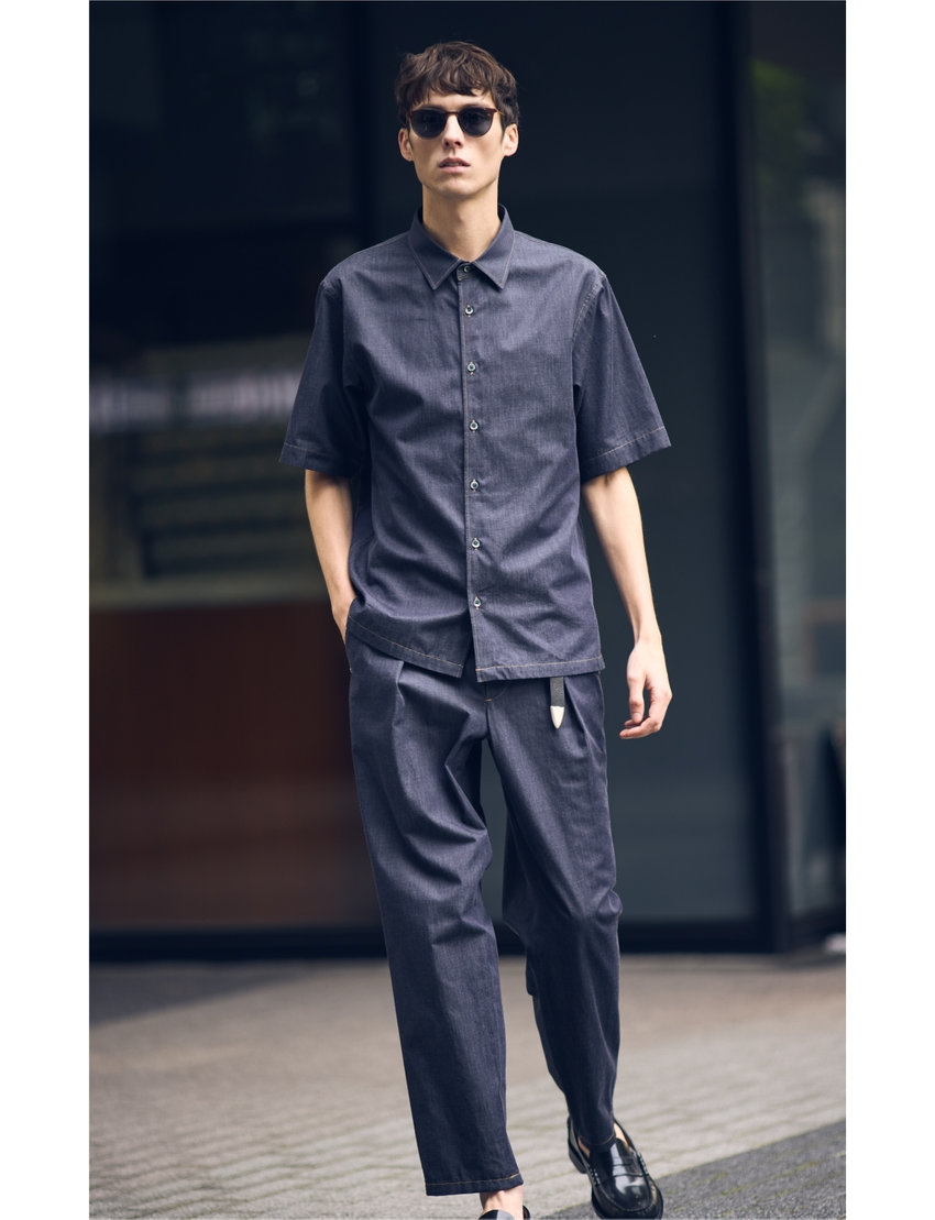 繊細な糸で創られた、しなやかで上品なデニムライクのシャツは、さらっと着るだけで主役になる一着。ボタンを上まで留めてきちんと着たい。同素材のデニムスラックスを合わせてセットアップ風に。プンターレベルトを垂らして、着こなしのアクセントに。