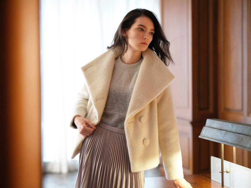 2022 A/W COLLECTIONDECEMBER2022 A/W COLLECTION からみ織り シャギーJacket ¥79,200 / Skirt ¥39,600 Tax in more ミックスマッチ 異なる素材を組み合わせてDress ¥69,300 Tax in more カレッジ トラッドLong Jacket ¥46,200 / Pullover ¥17,600 / Pants ¥25,300 Tax in more